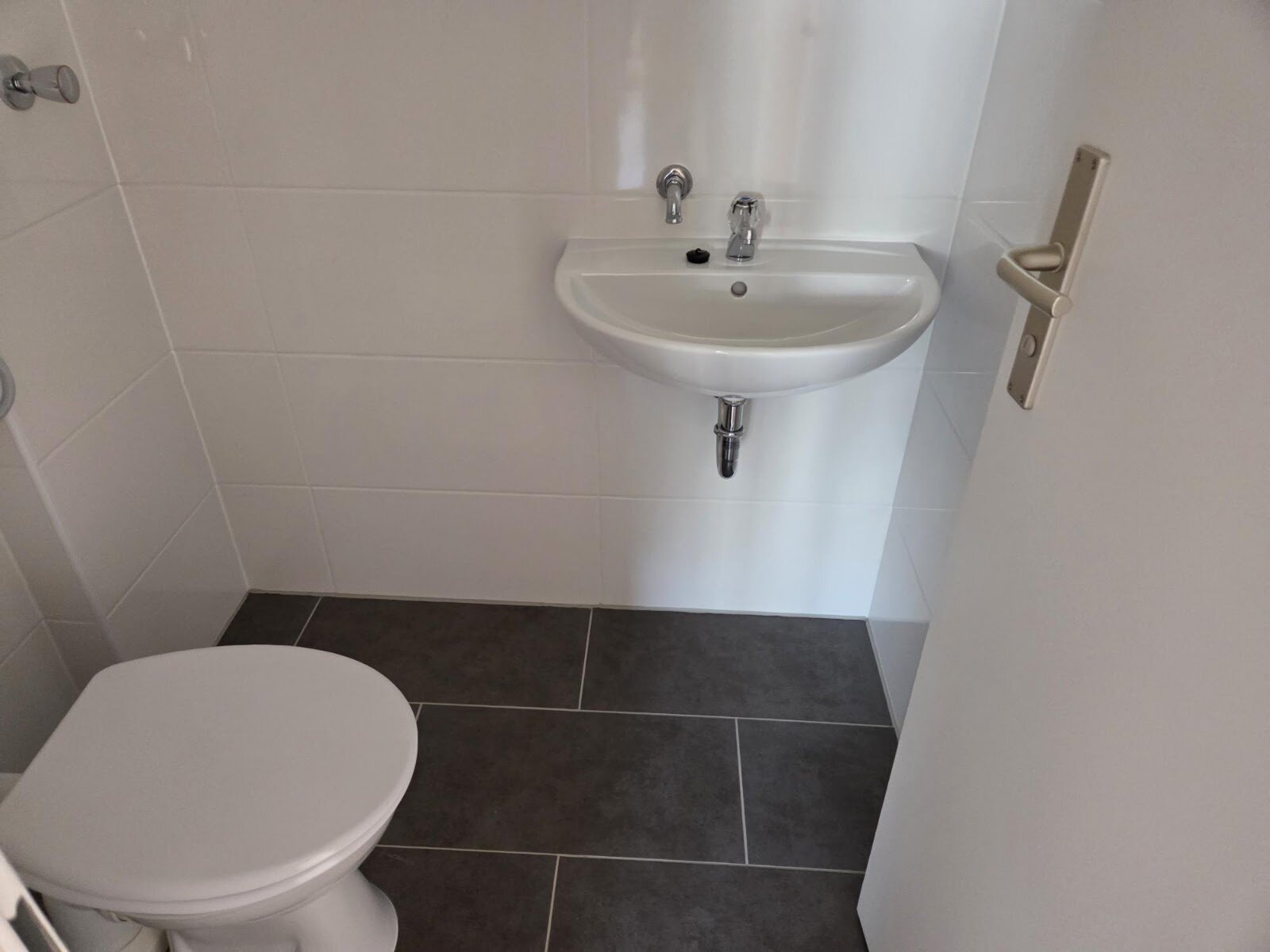 - Anthrazite Boden- und weiße Wandfliesen im Bad