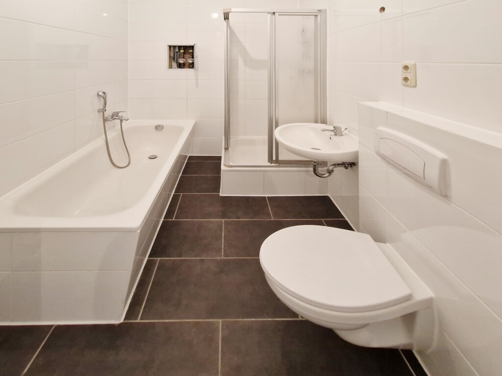- Anthrazite Boden- und weiße Wandfliesen im Bad
