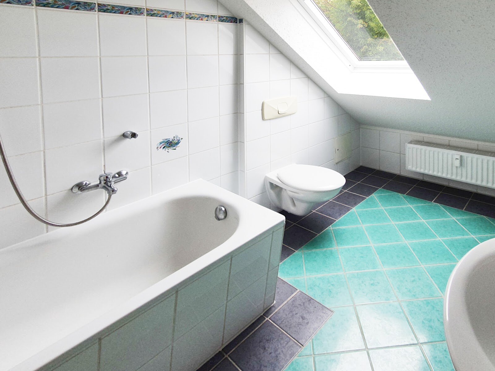 - Grüne Boden- und weiße Wandfliesen im Bad