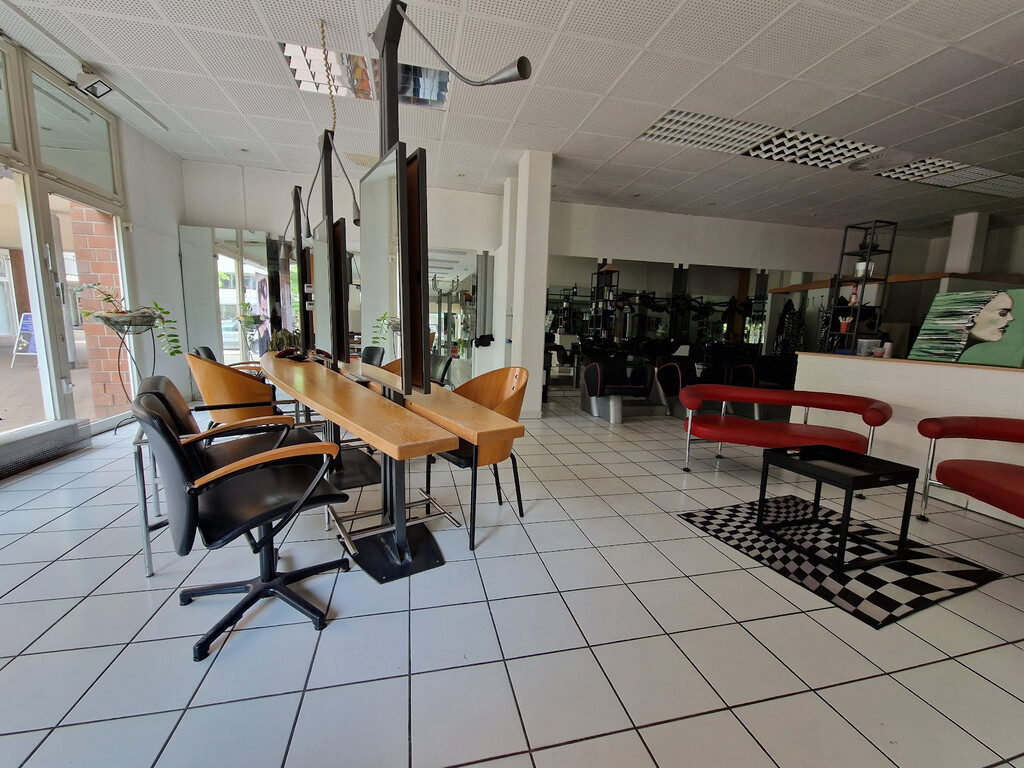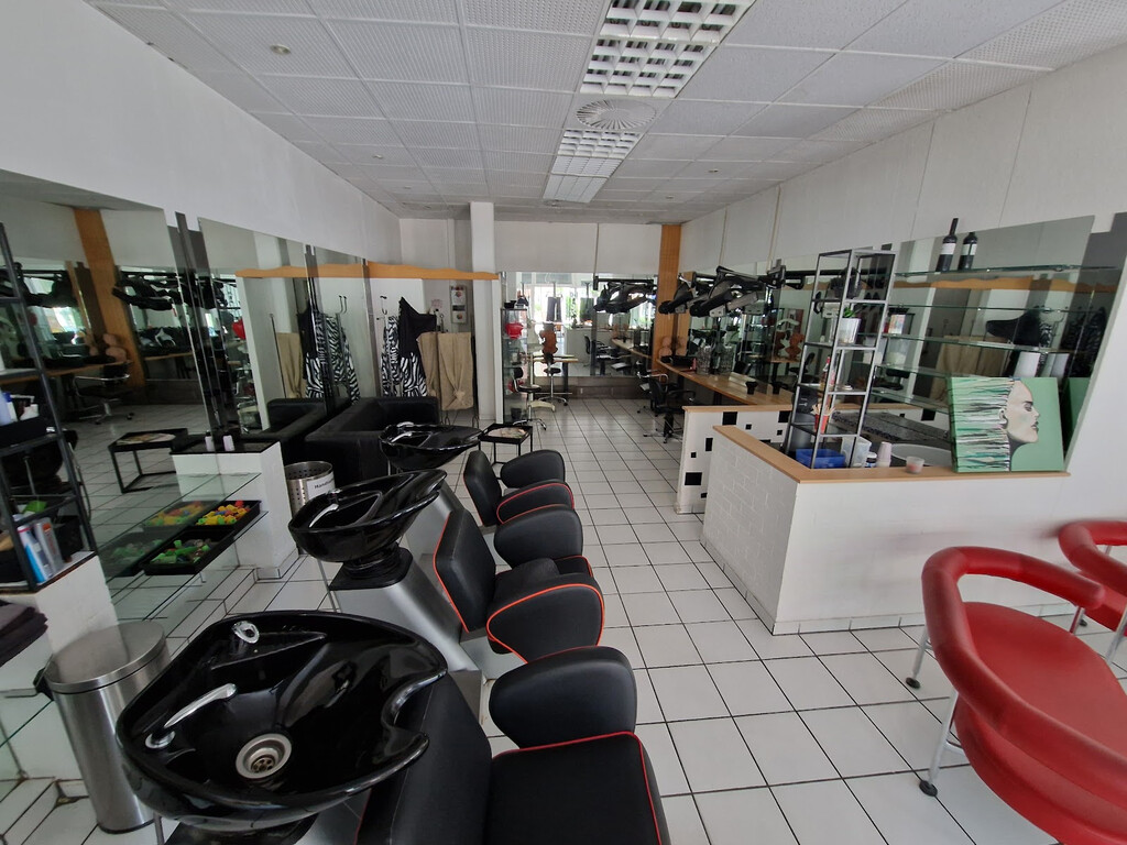 Friseursalon mit ausreichenden Bedienplätzen, Waschplätzen, einer Rezeption, einem Wartebereich, Geräte, Spiegel und Stauraum