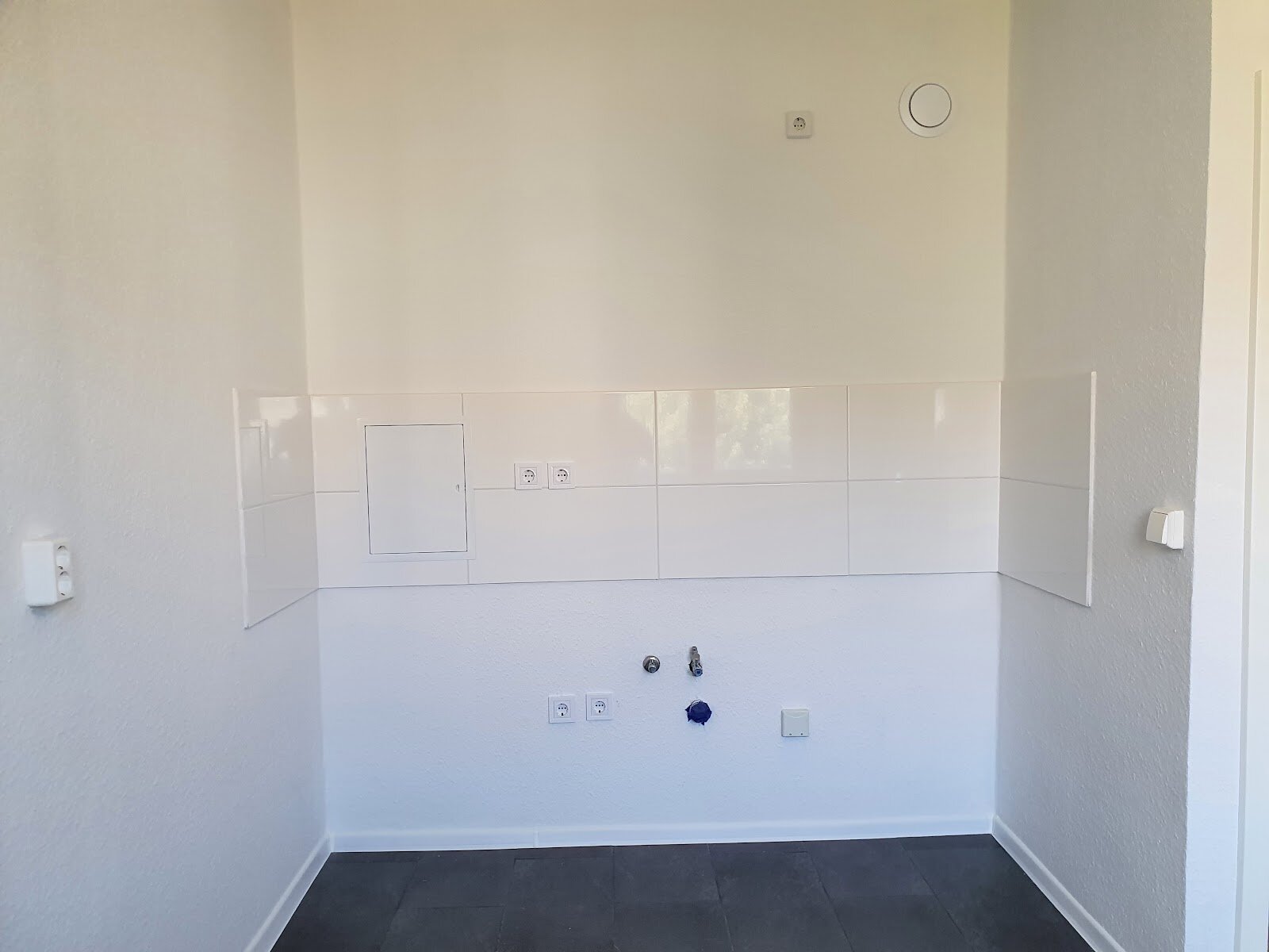 - Anthrazite Boden- und weiße Wandfliesen in der Küche