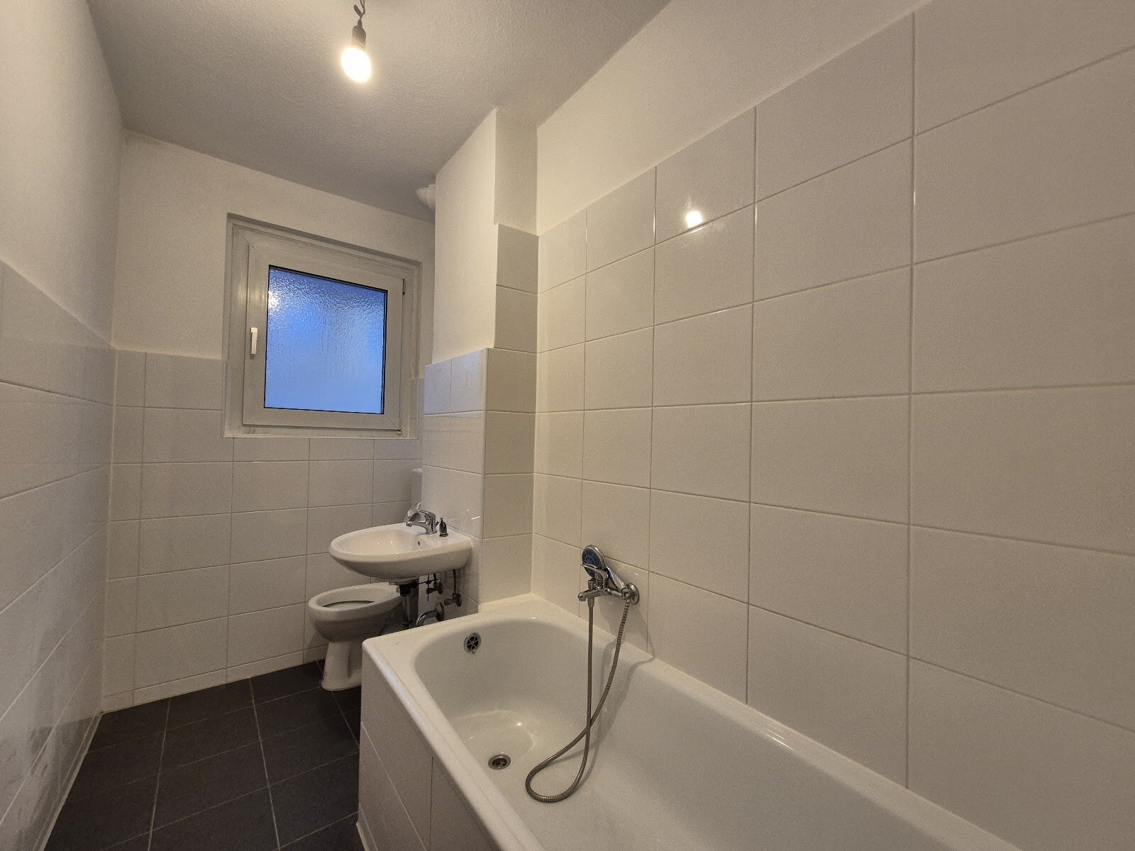 - Anthrazite Boden- und weiße Wandfliesen im Bad
