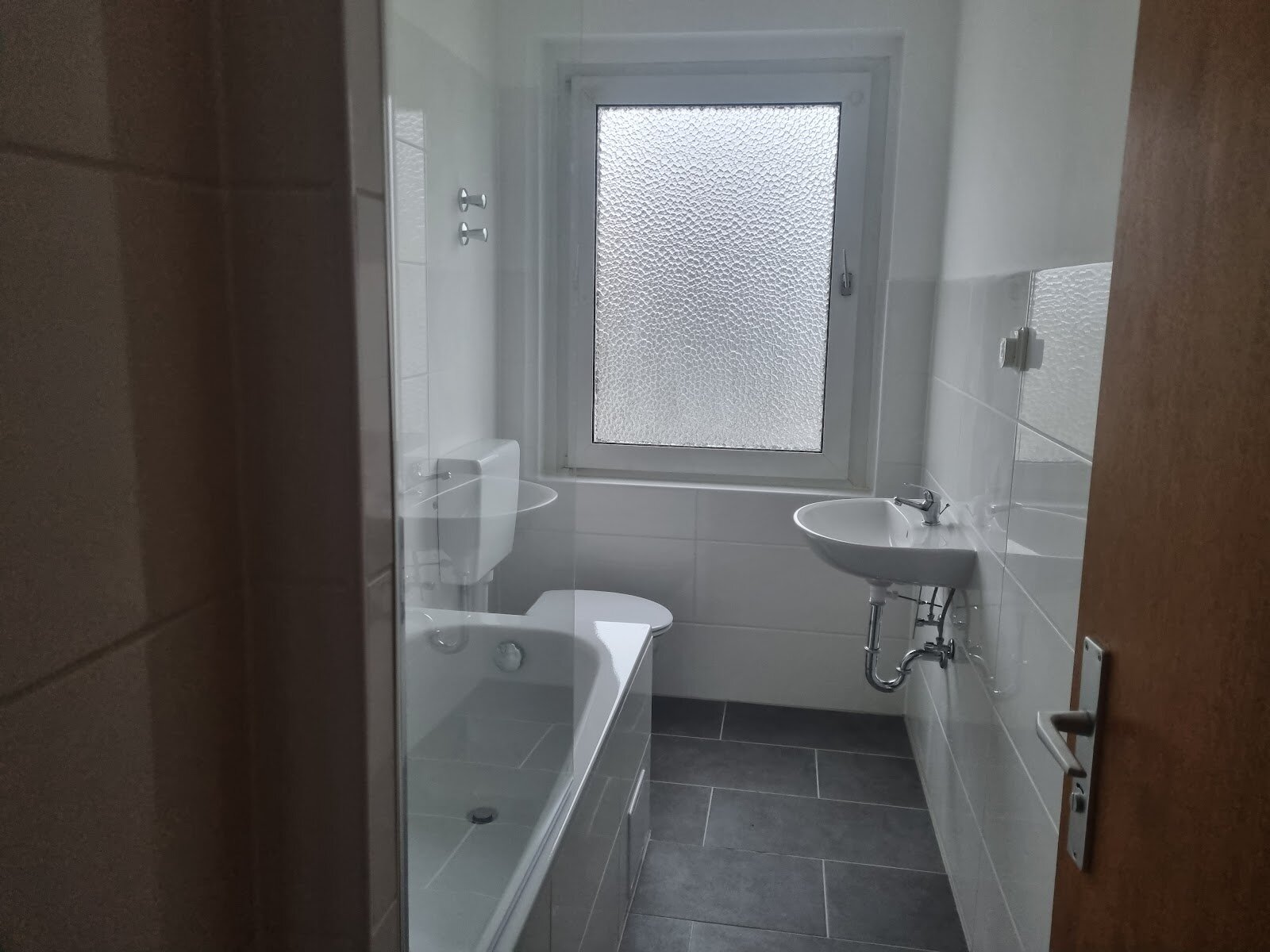 - Anthrazite Boden- und weiße Wandfliesen im Bad