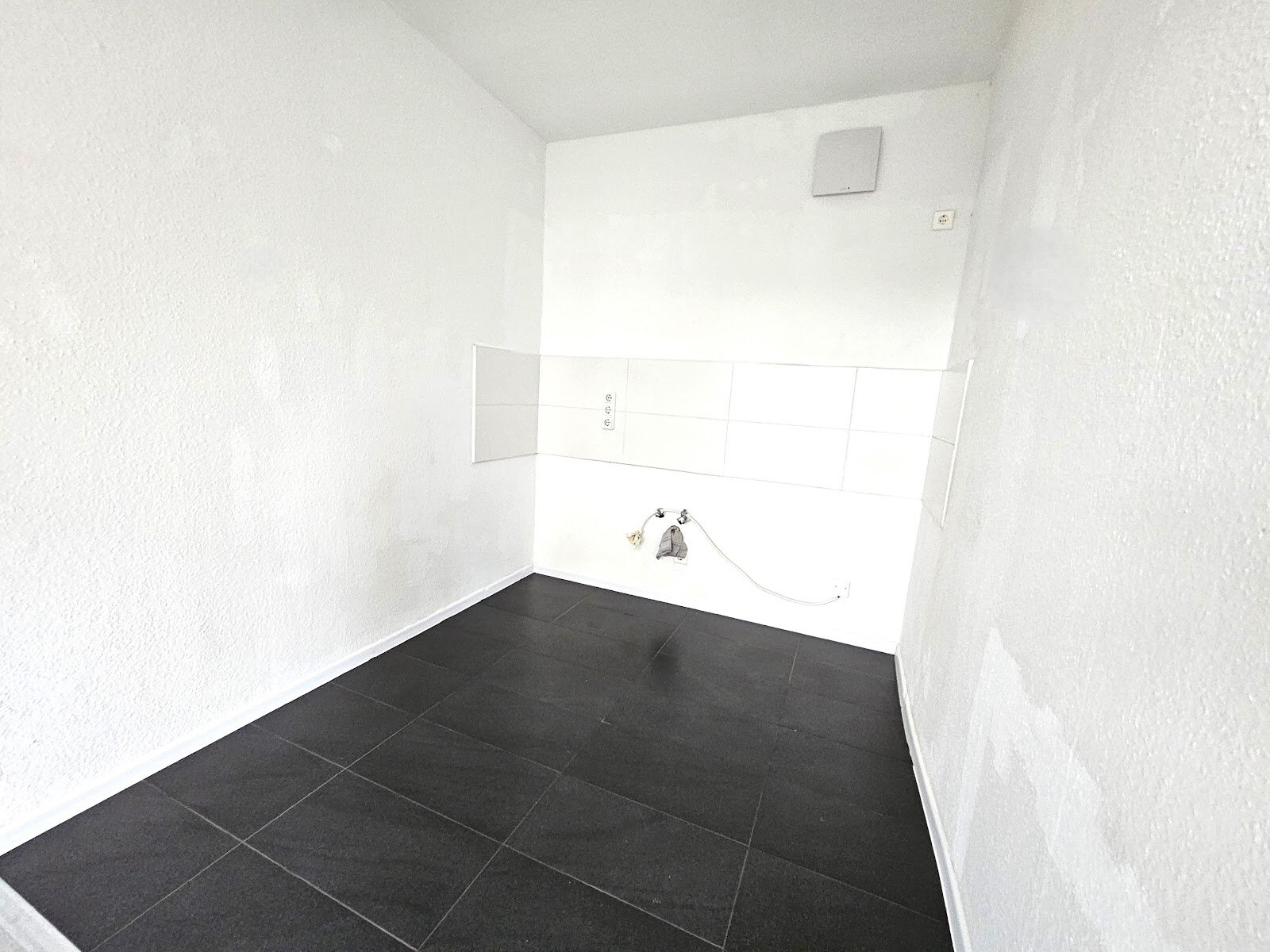 - Anthrazite Boden- und weiße Wandfliesen in der Küche