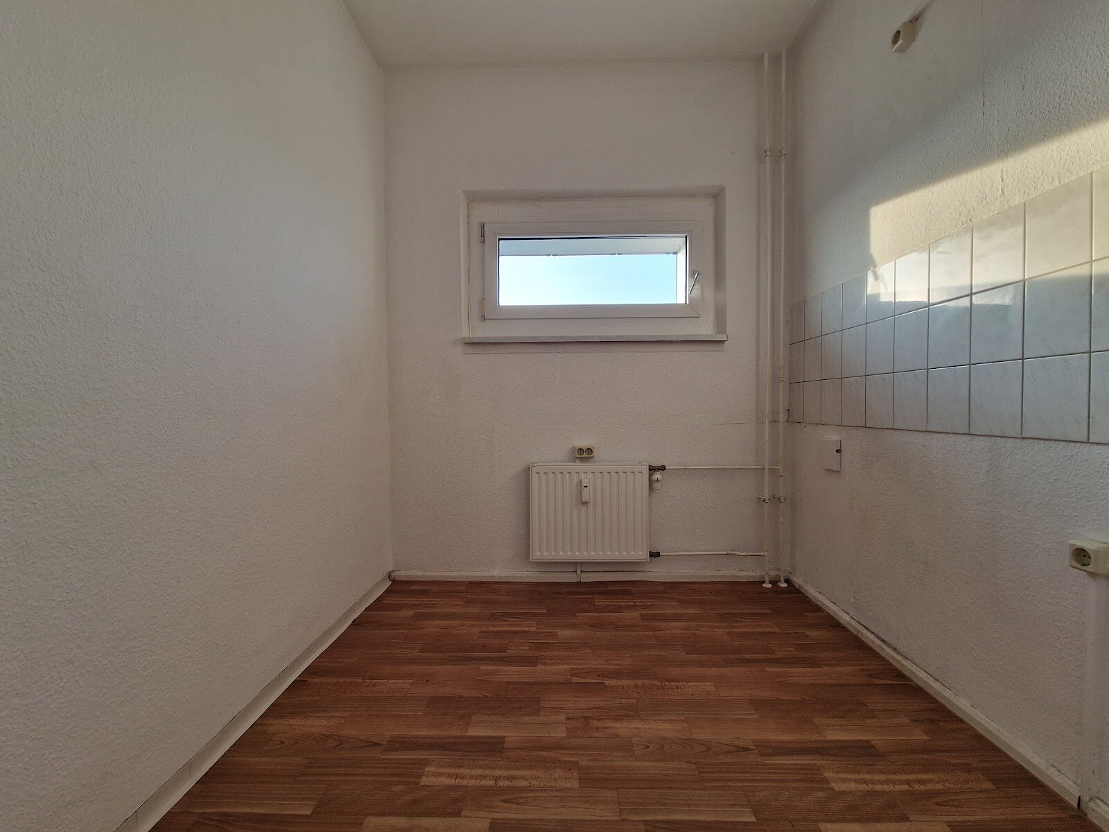 - PVC- Bodenbelag- und weiße Wandfliesen in der Küche