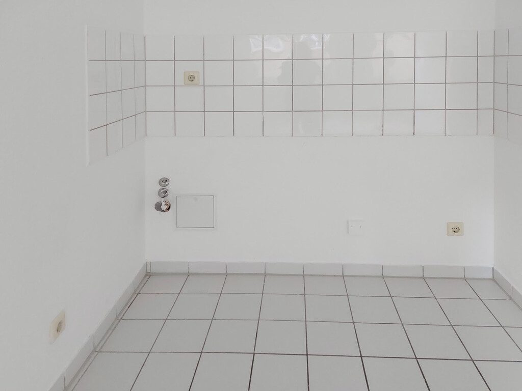 - PVC Boden- und weiße Wandfliesen in der Küche