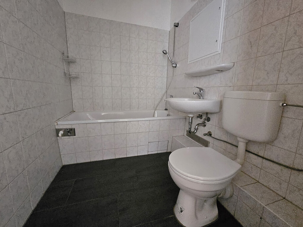 - Anthrazite Boden- und weiße Wandfliesen im Bad