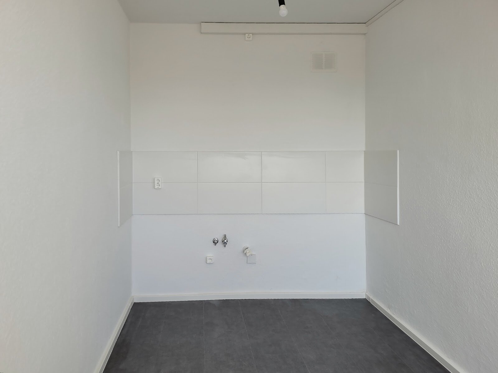 - Anthrazite Boden- und weiße Wandfliesen in der Küche