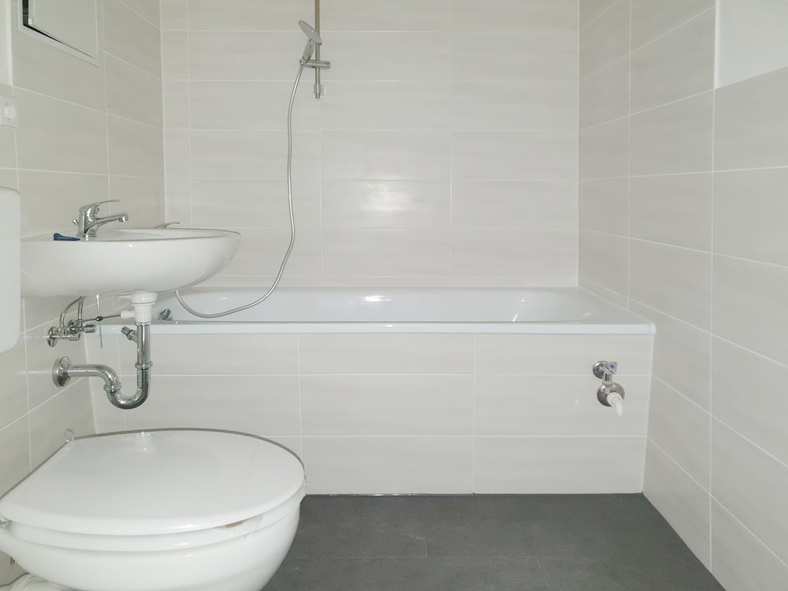 - Anthrazite Boden- und weiße Wandfliesen im Bad