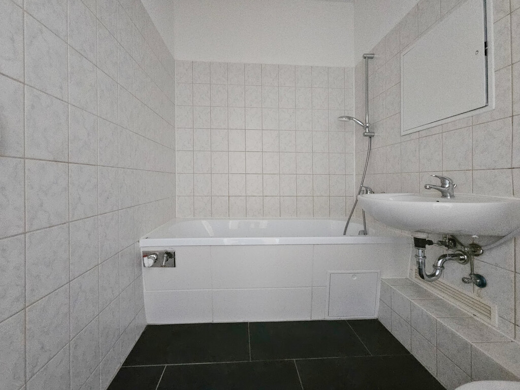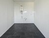 - Anthrazite Boden- und weiße Wandfliesen im Bad