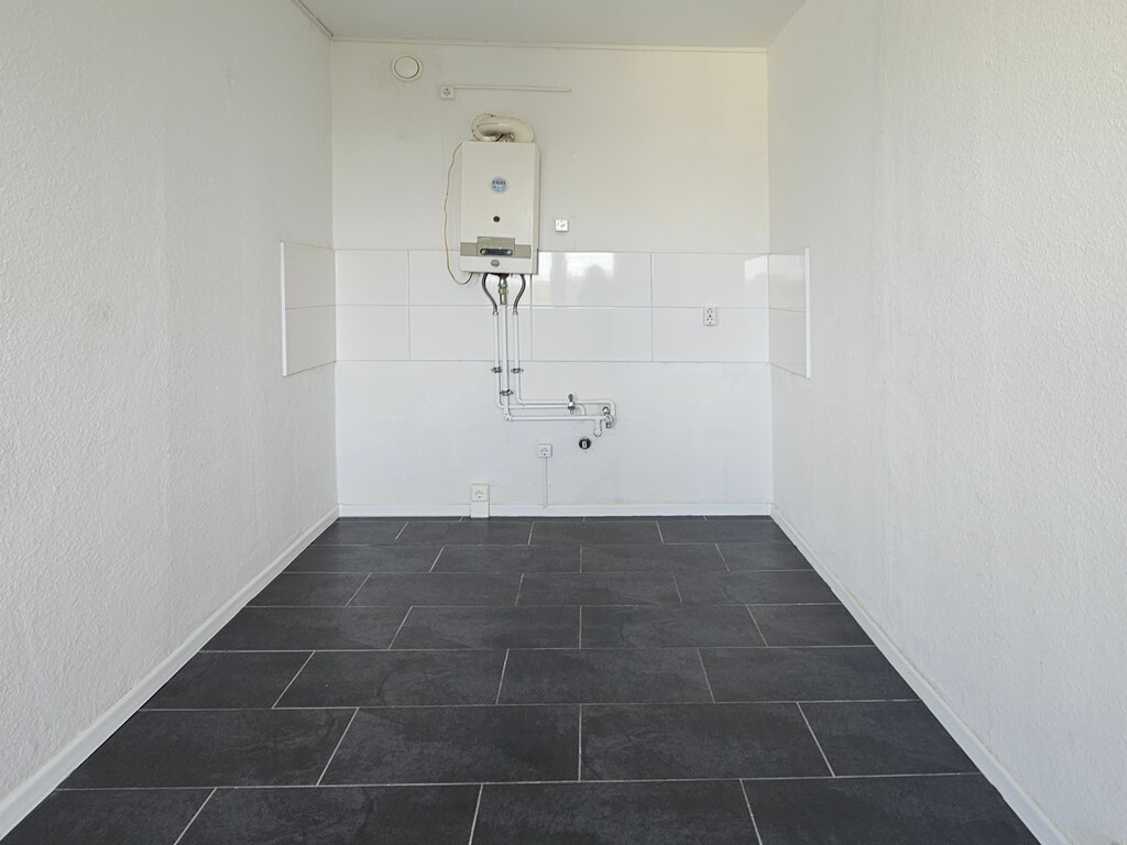 - Anthrazite Boden- und weiße Wandfliesen in der Küche