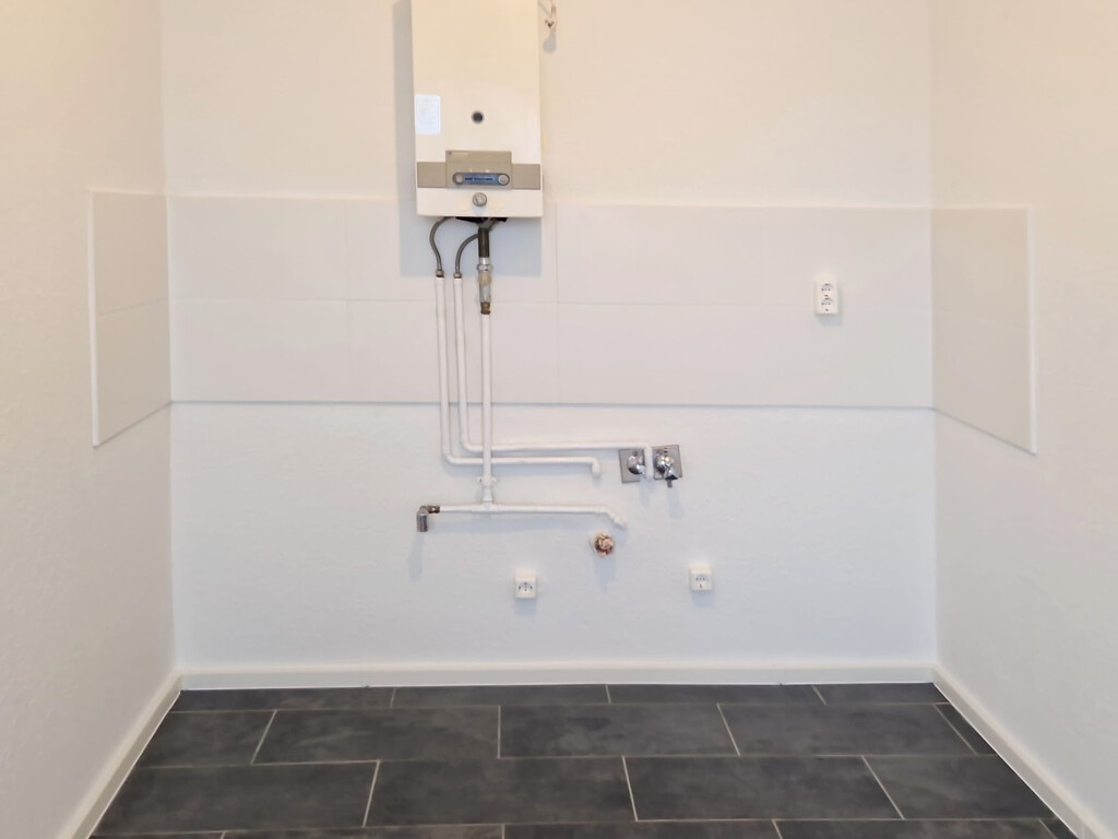 - Anthrazite Boden- und weiße Wandfliesen in der Küche