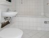 - Weiße Boden- und weiße Wandfliesen im Bad