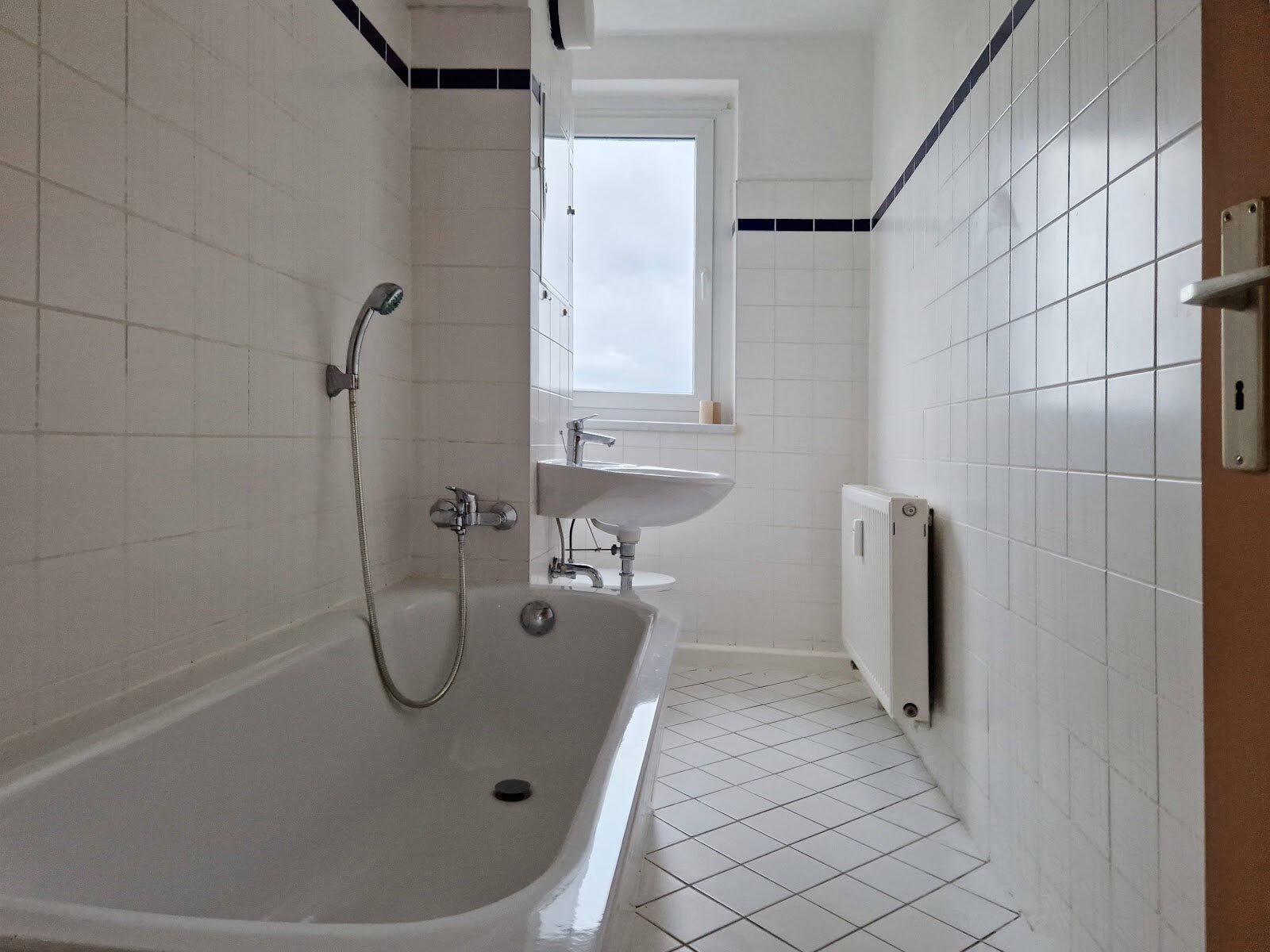 - Weiße Boden- und Wandfliesen im Bad