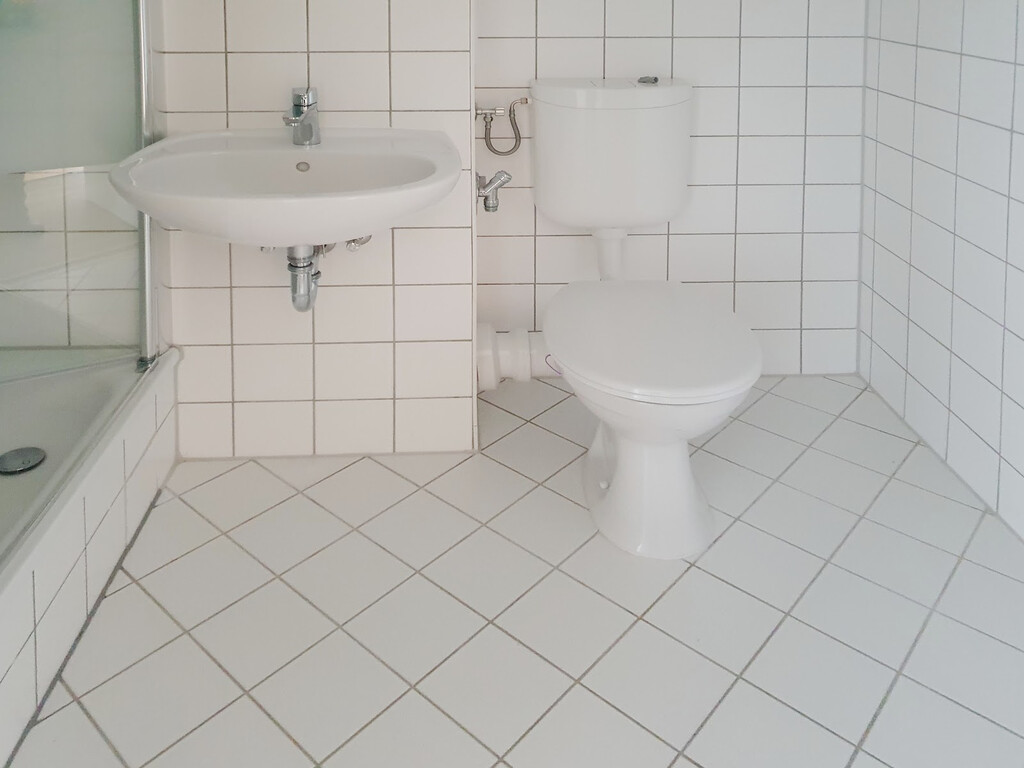 - Anthrazite Boden- und weiße Wandfliesen im Bad