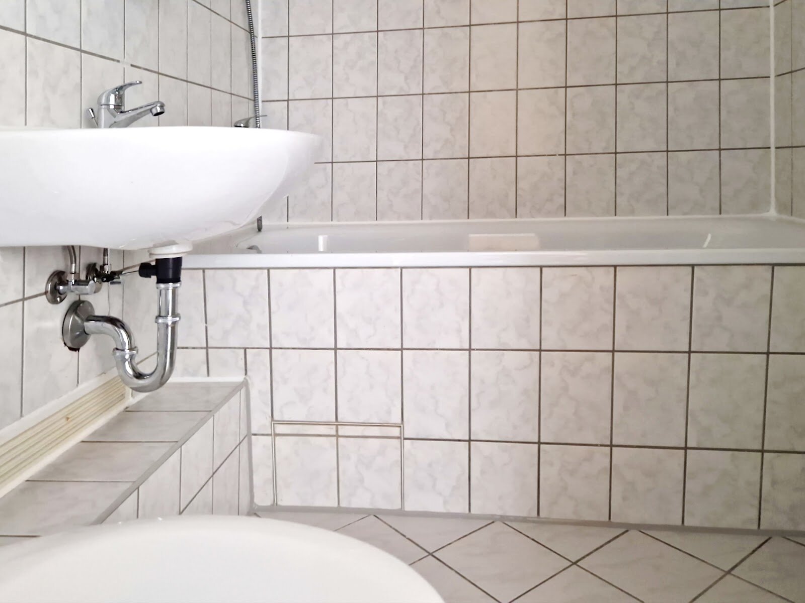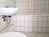 - Weiße Boden- und weiße Wandfliesen im Bad