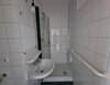 - Weiße Boden- und weiße Wandfliesen im Bad