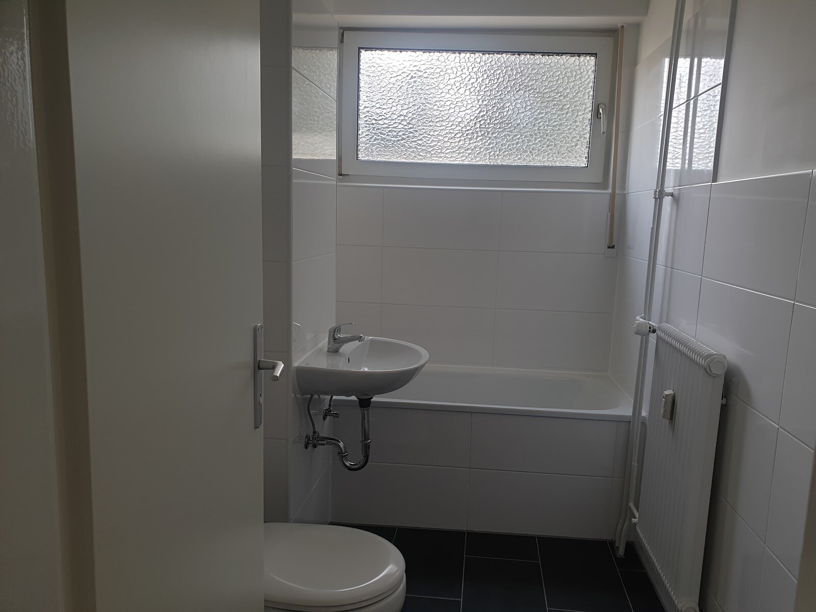 - Anthrazite Boden- und weiße Wandfliesen im Bad