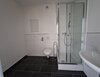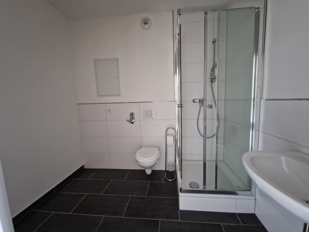 - Anthrazite Boden- und weiße Wandfliesen im Bad
