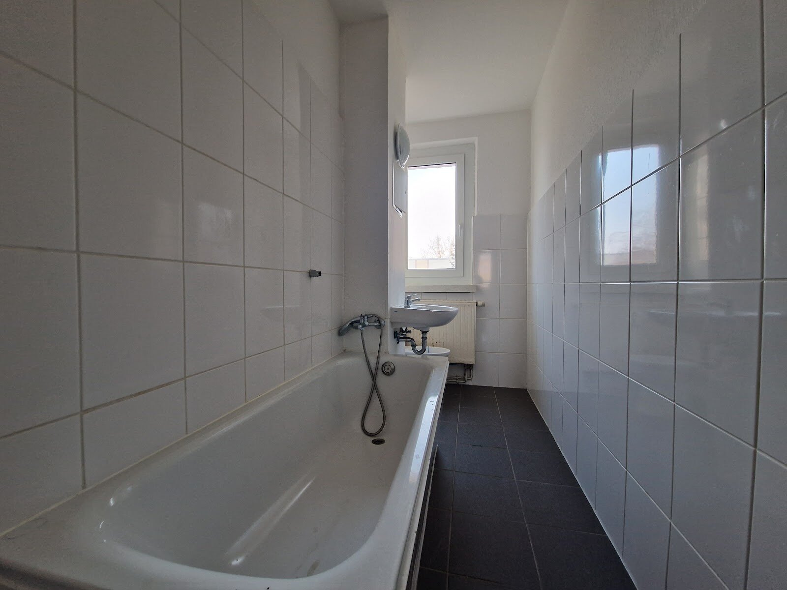 - Anthrazite Boden- und weiße Wandfliesen im Bad