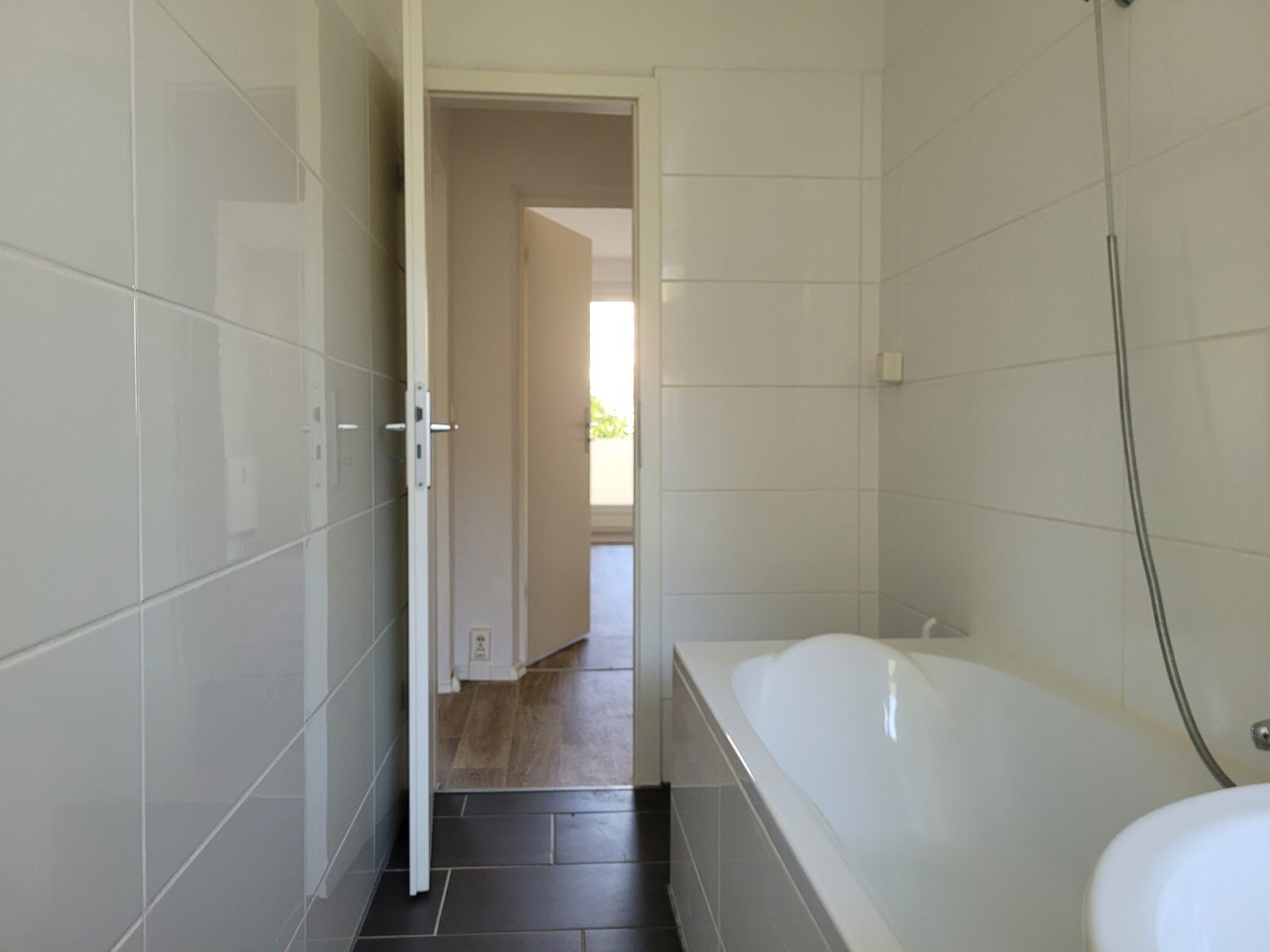 - Anthrazite Boden- und weiße Wandfliesen im Bad