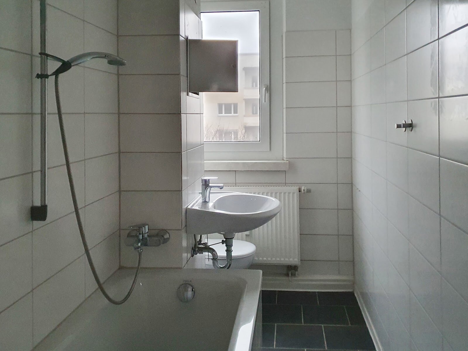 - Anthrazite Boden- und weiße Wandfliesen im Bad