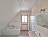 - Anthrazite Boden- und weiße Wandfliesen im Bad