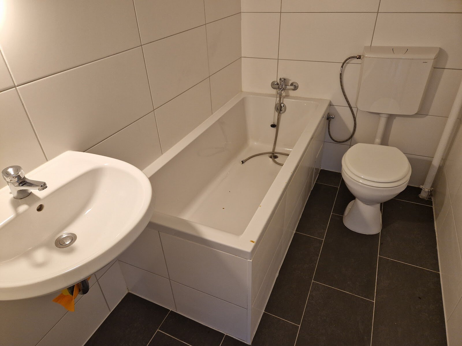 - Anthrazite Boden- und weiße Wandfliesen im Bad