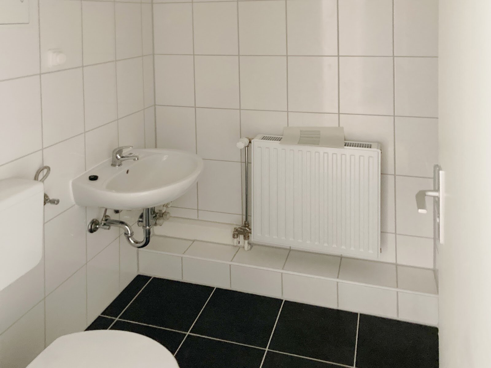 - Anthrazite Boden- und weiße Wandfliesen im Bad