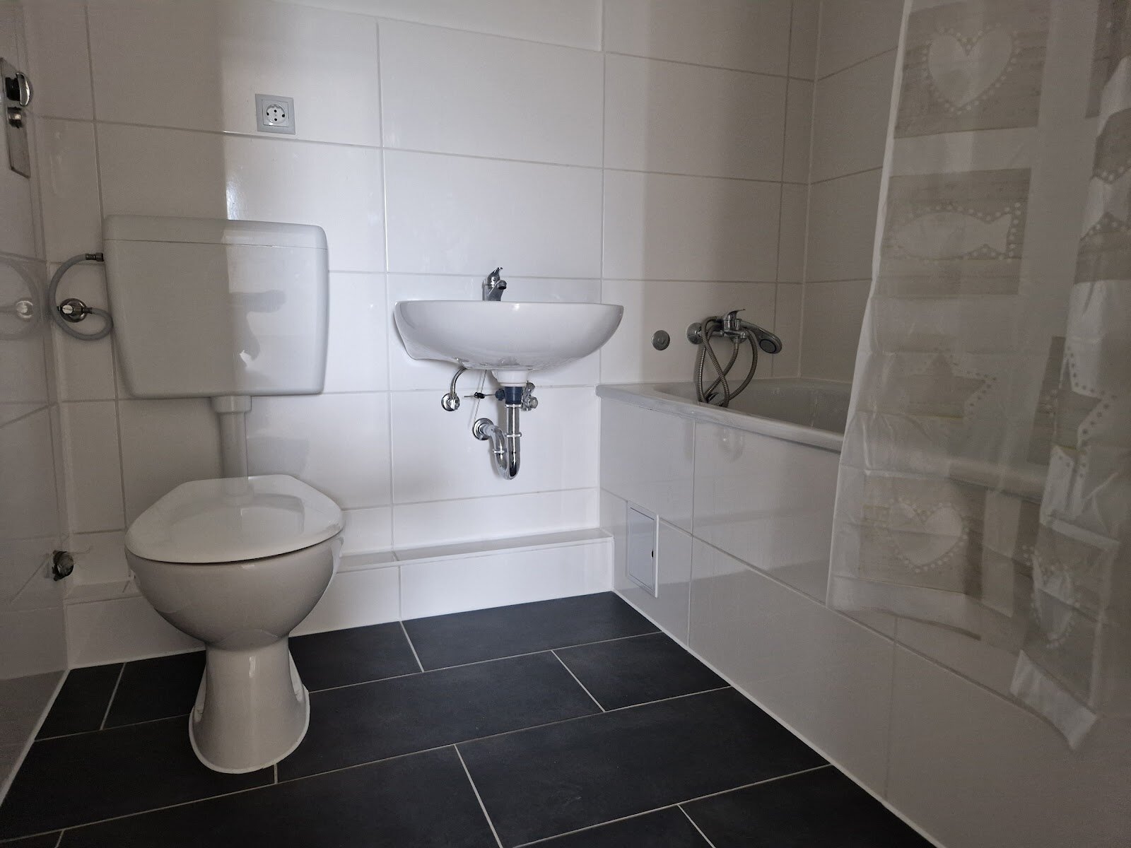 - Anthrazite Boden- und weiße Wandfliesen im Bad