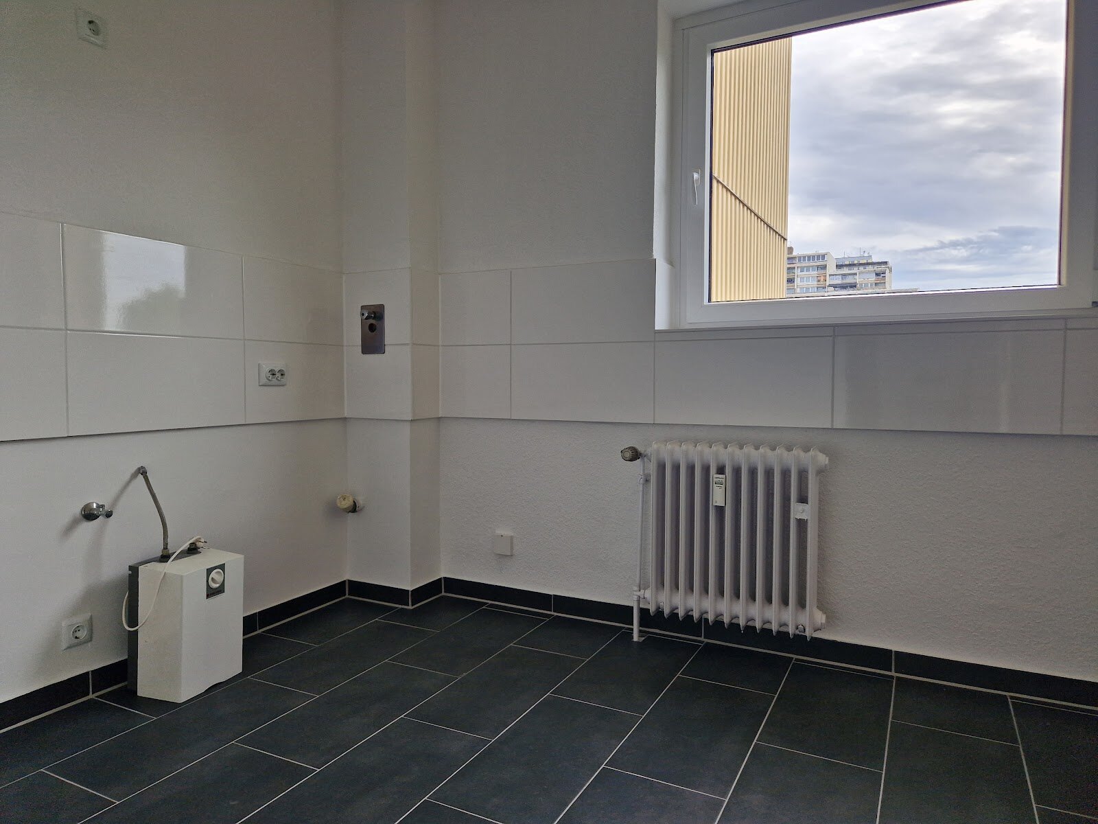 - Anthrazite Boden- und weiße Wandfliesen in der Küche