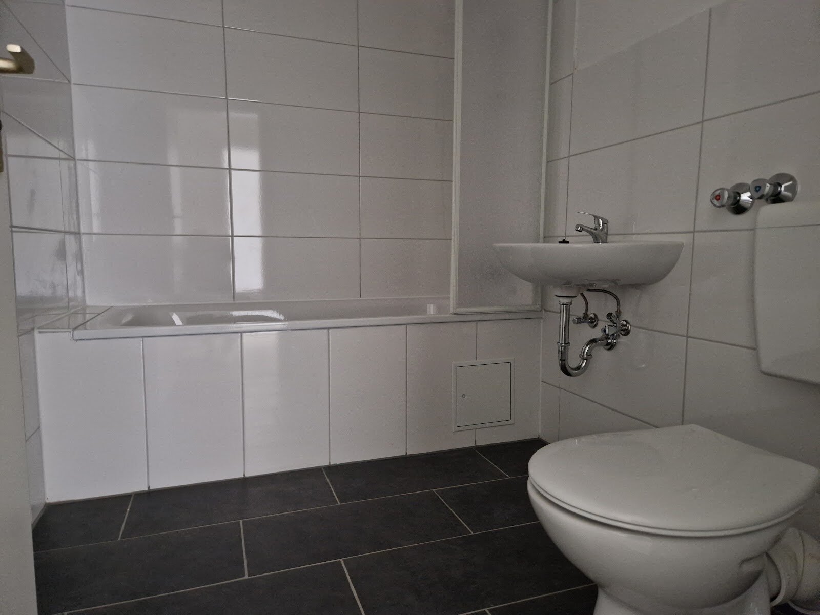 - Anthrazite Boden- und weiße Wandfliesen im Bad