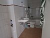 - Anthrazite Boden- und weiße Wandfliesen im Bad
