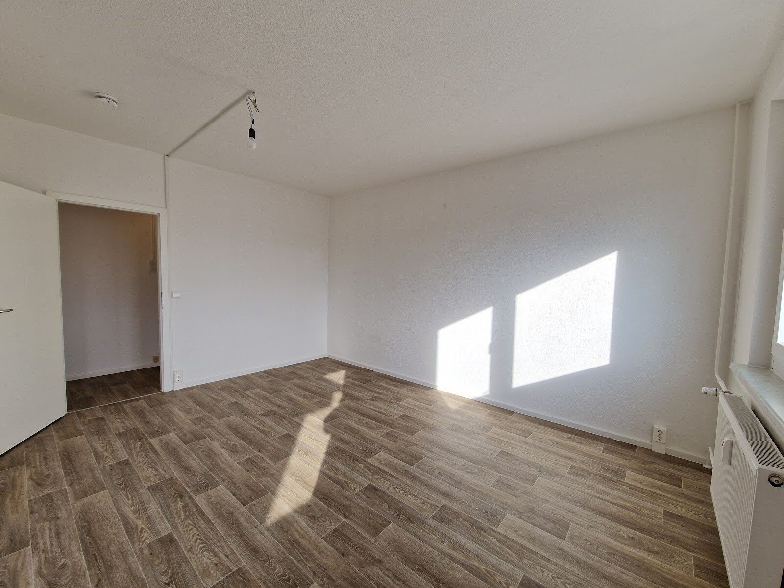 - Wohnbereich mit PVC-Boden und Raufasertapete – schlicht, pflegeleicht, bereit für Ihre Einrichtungsideen