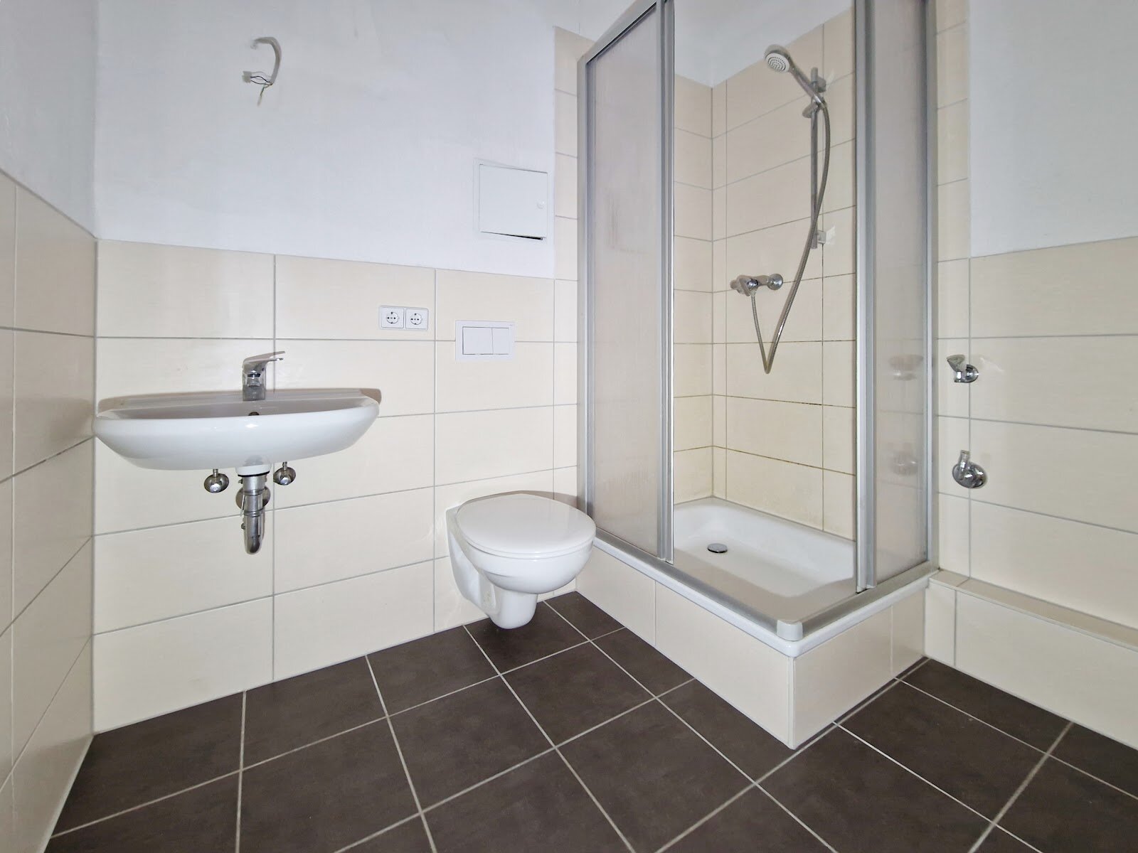 - Anthrazite Boden- und helle Wandfliesen im Bad