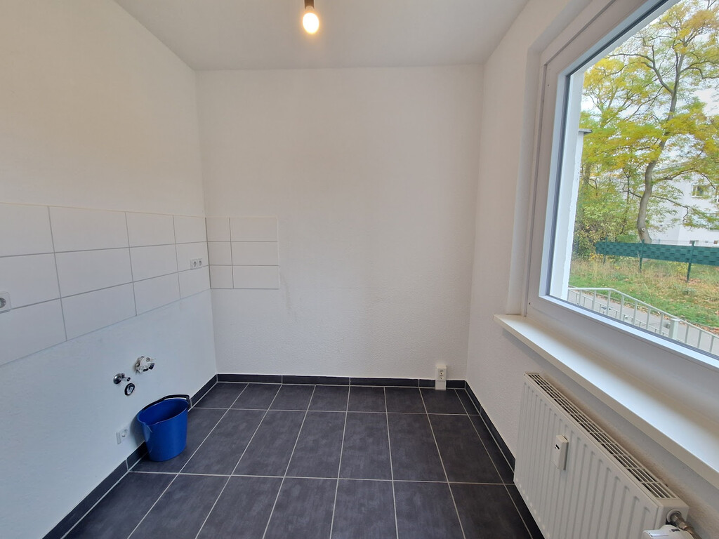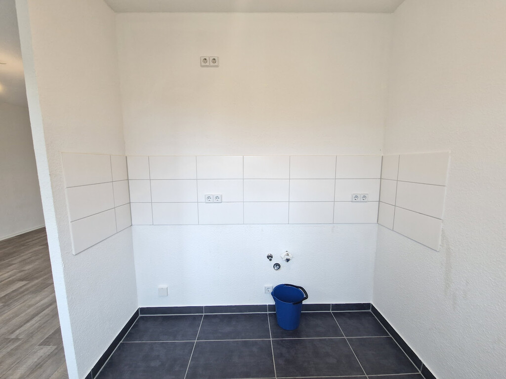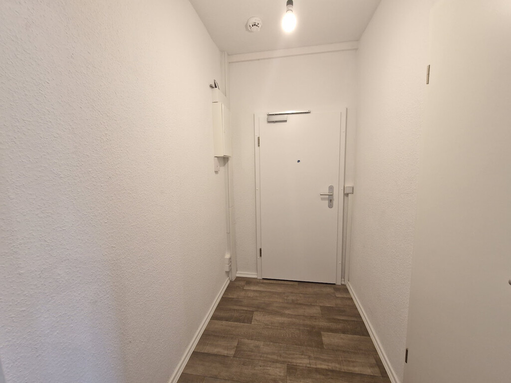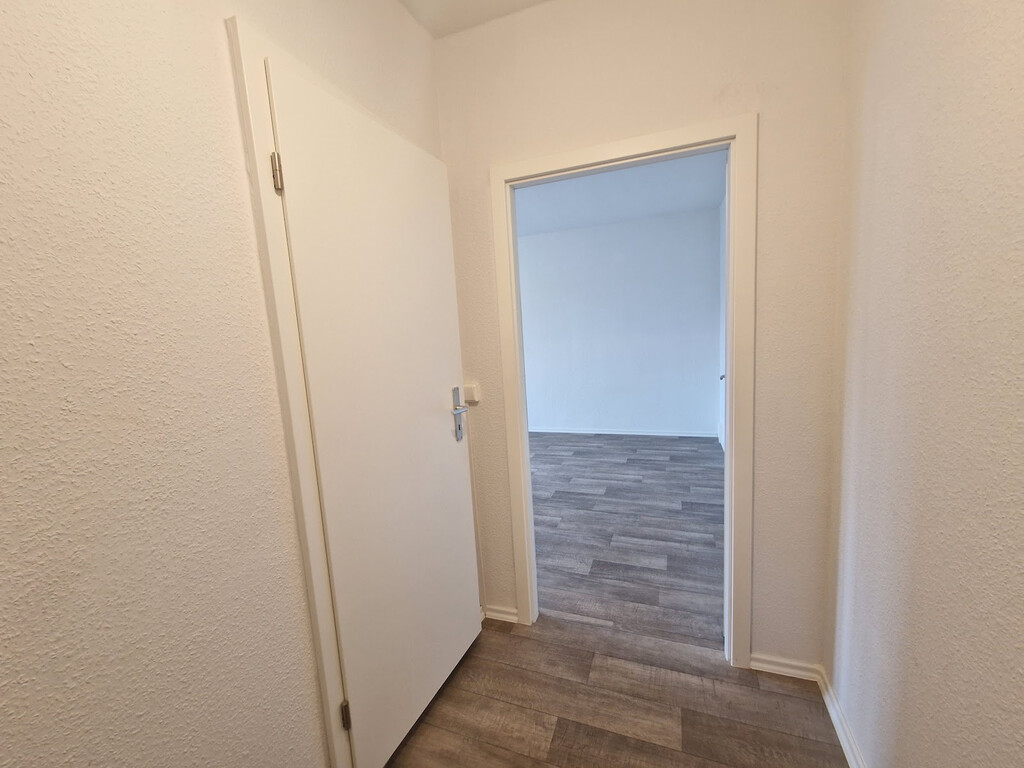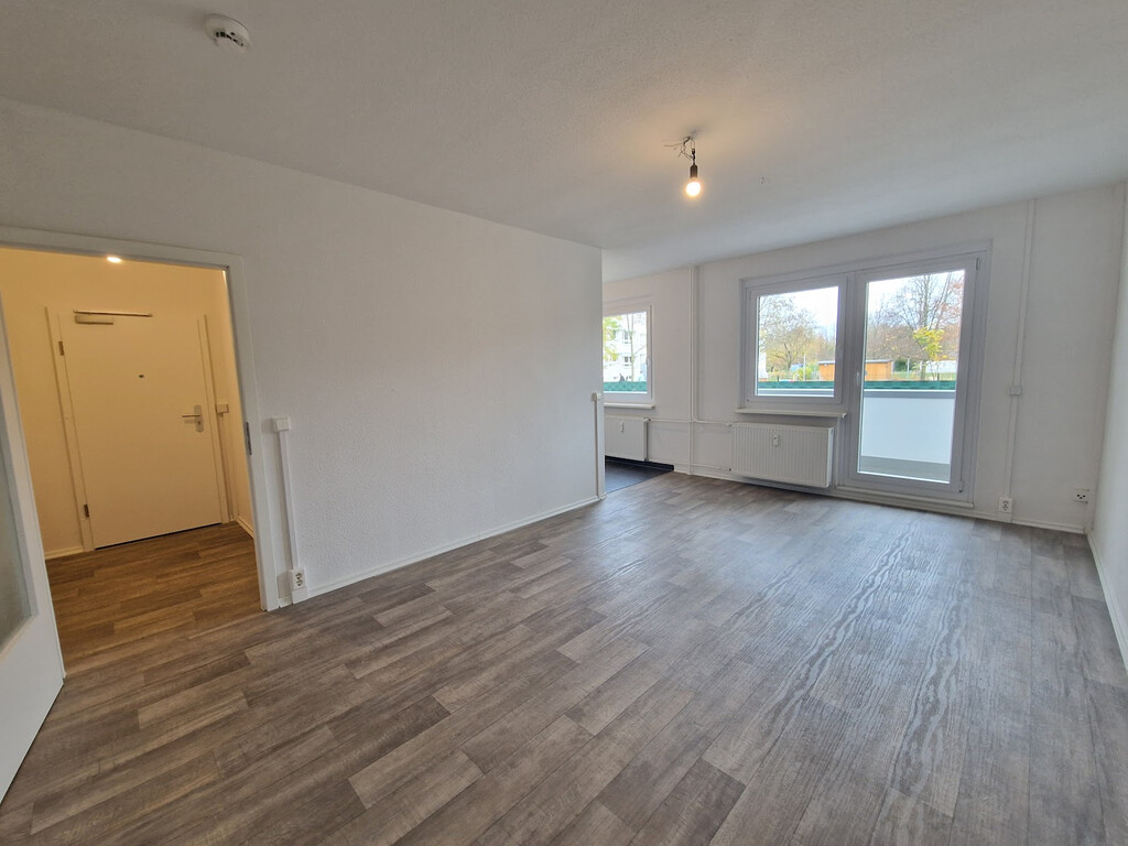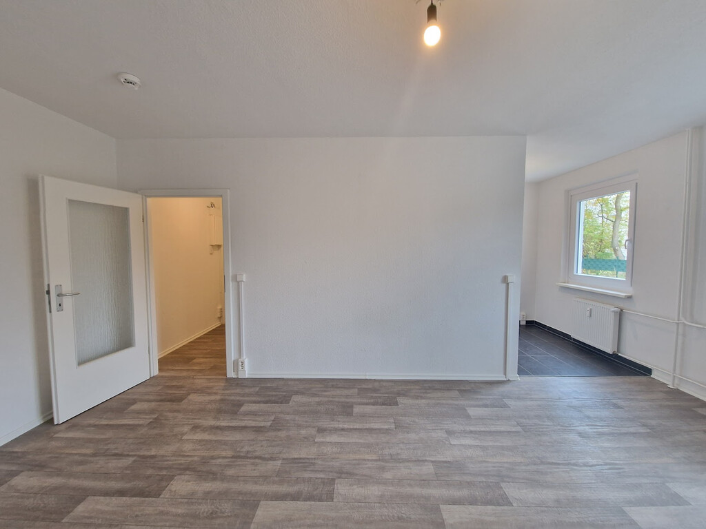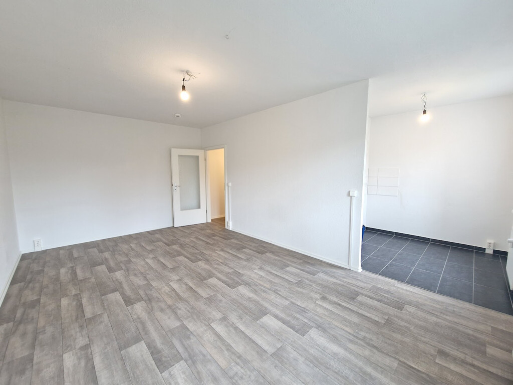 - Wohnbereich mit PVC-Boden und Raufasertapete – schlicht, pflegeleicht, bereit für Ihre Einrichtungsideen
