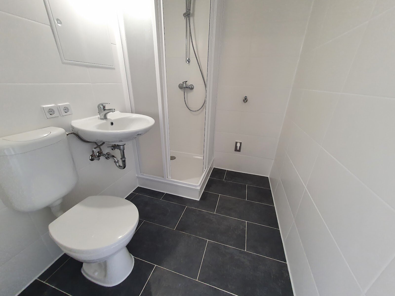- Anthrazite Boden- und weiße Wandfliesen im Bad