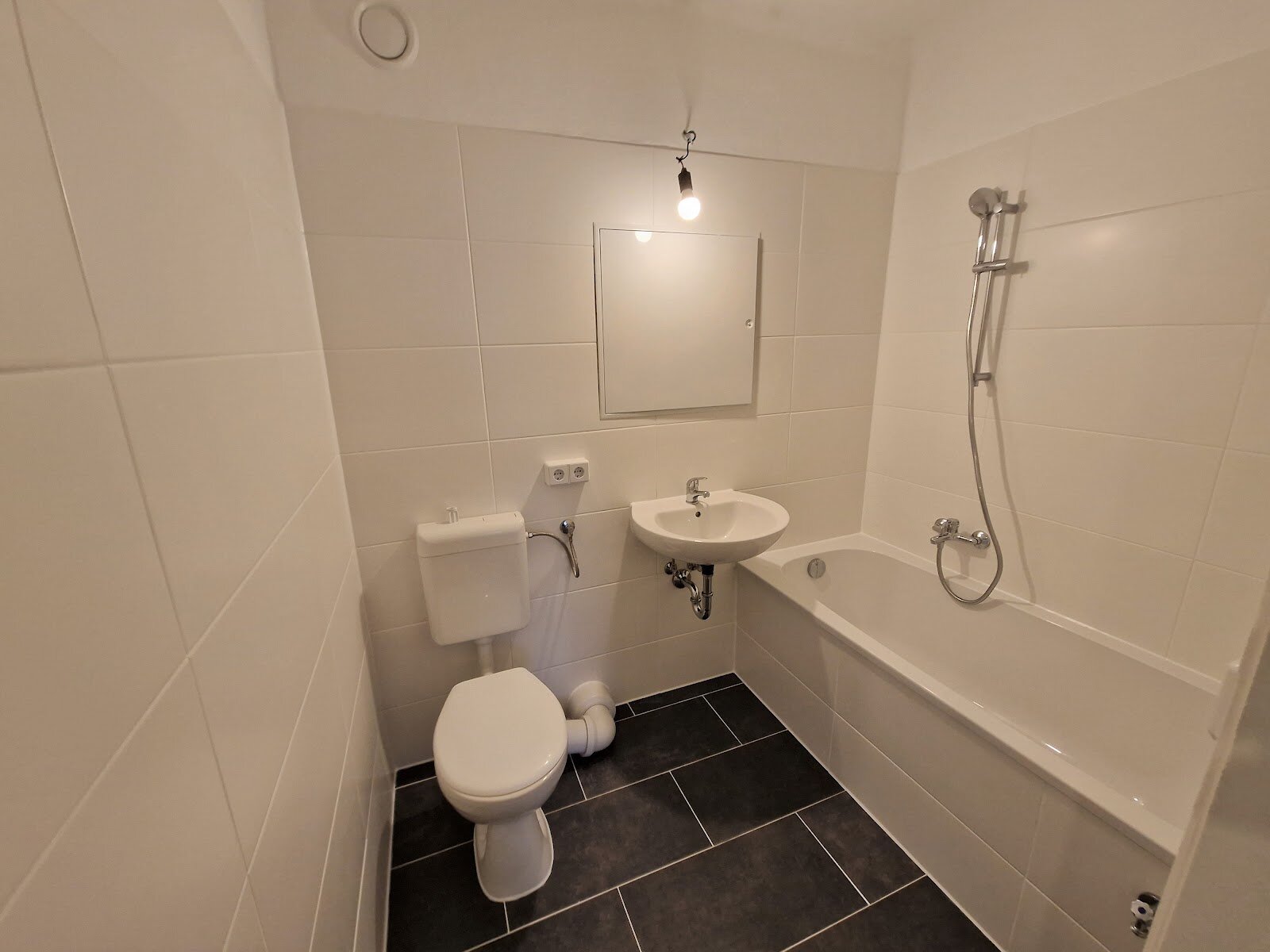 - Anthrazite Boden- und weiße Wandfliesen im Bad