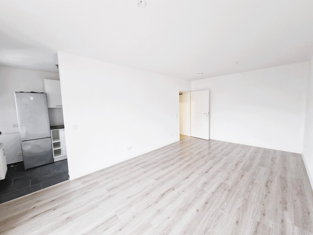 - Wohnbereiche mit Laminatboden und weißer Raufasertapete – schlicht, pflegeleicht, bereit für Ihre Einrichtungsideen