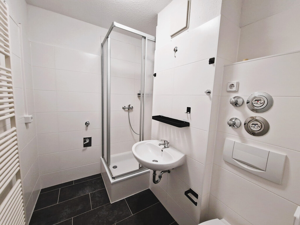 - Modernes Bad mit Dusche, Vorwandmontage und Waschmaschinenanschluss – praktisch & schick in Anthrazit und Weiß