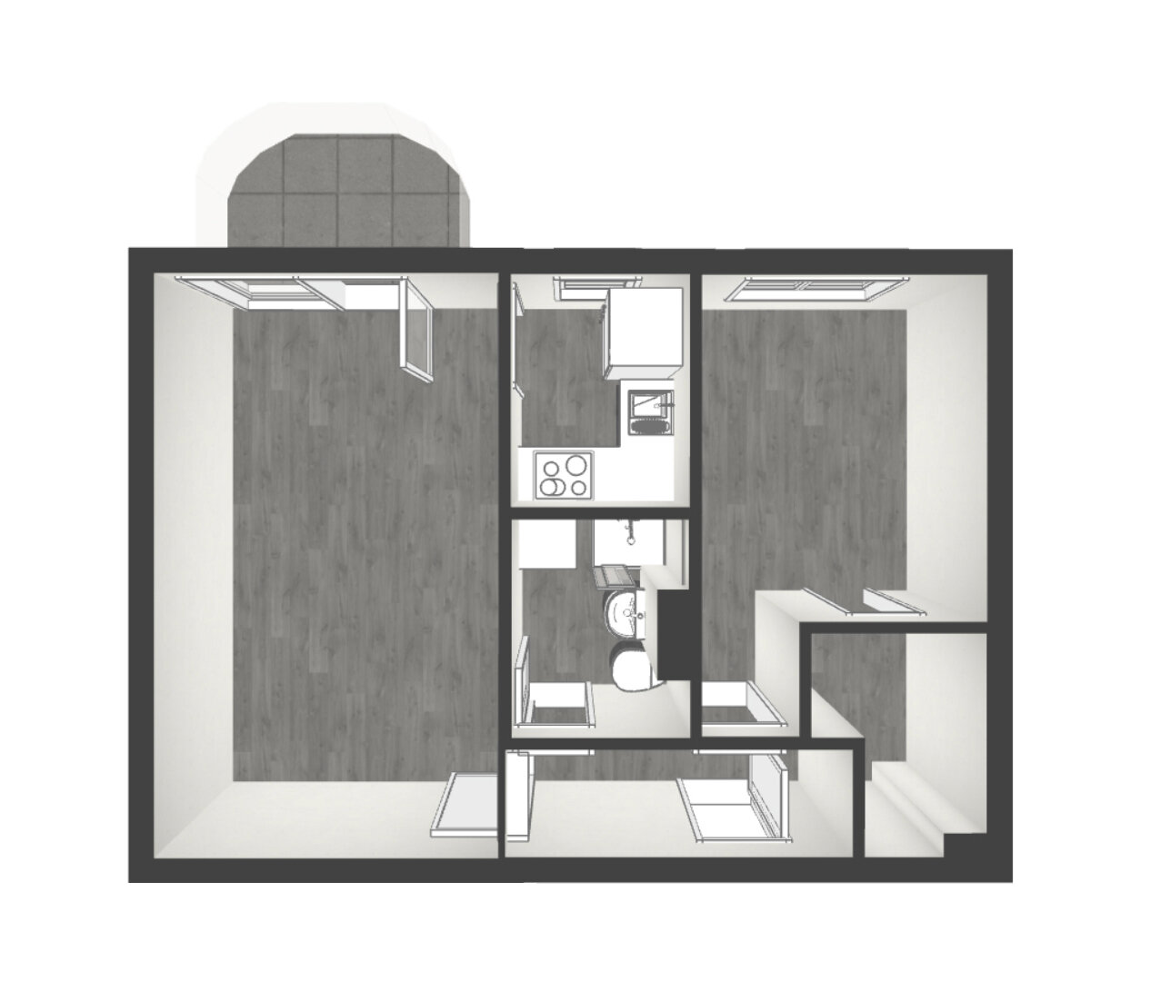 Die 2-Zimmer-Wohnung verteilt sich auf ca. 46 m² clever genutzt – perfekt für Minimalisten, Pendler oder den ersten eigenen Rückzugsort.