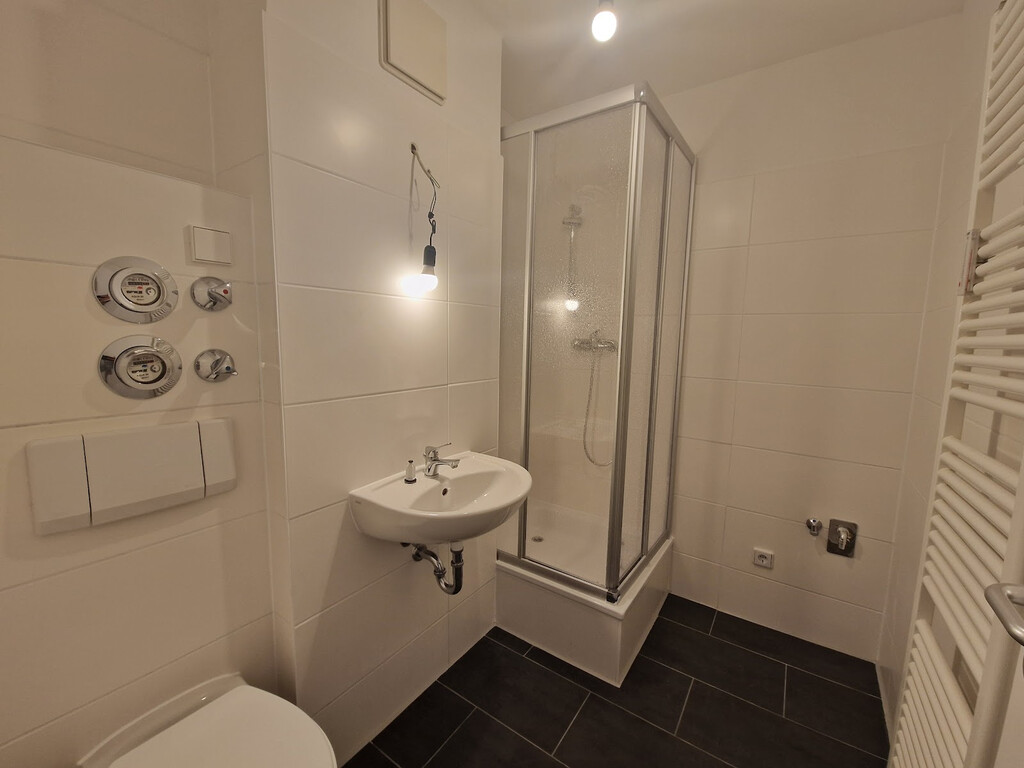 - Modernes Bad mit Dusche, Vorwandmontage und Waschmaschinenanschluss – praktisch & schick in Anthrazit und Weiß