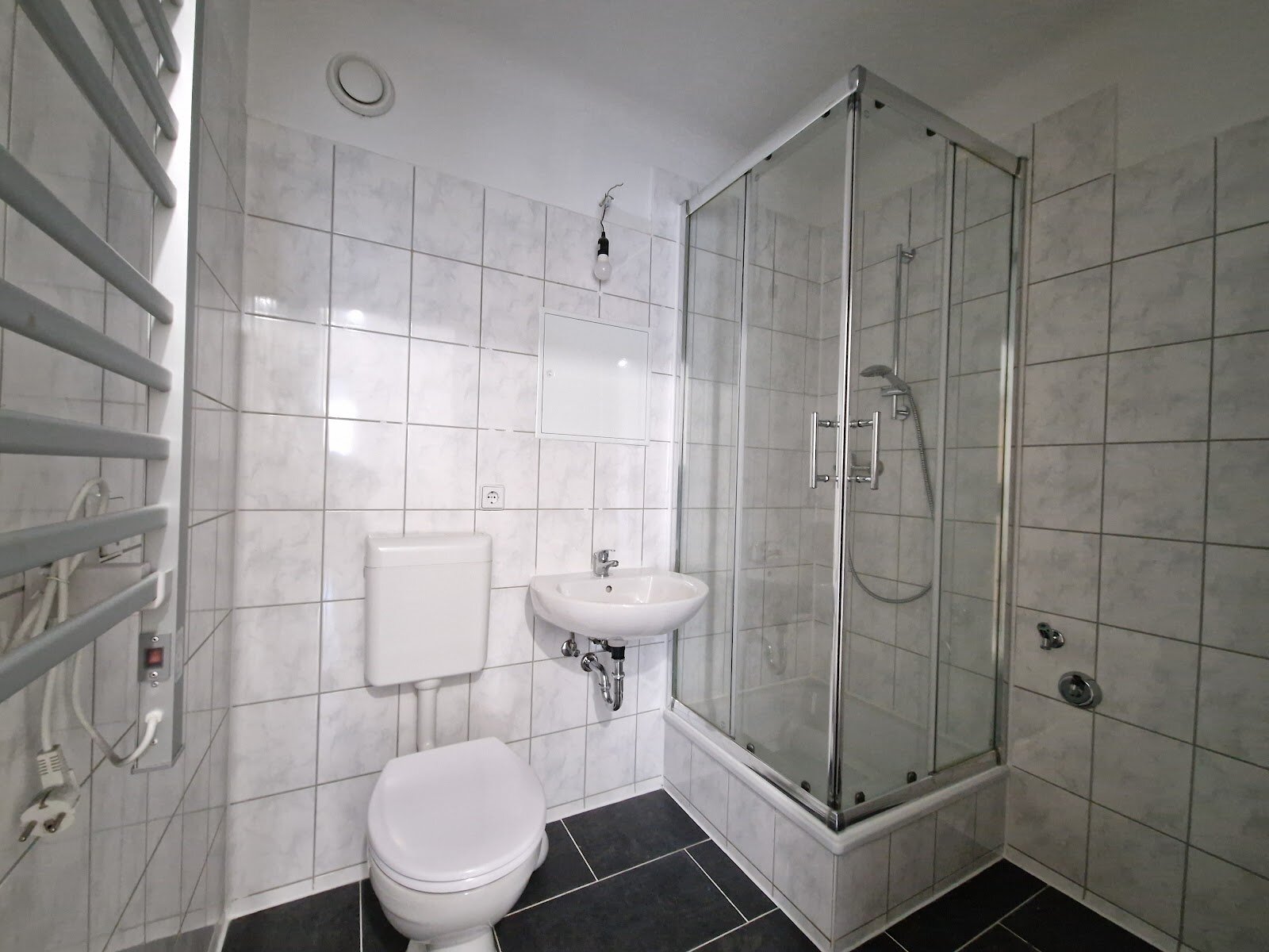 - Bad mit Dusche, Waschmaschinenanschluss und Handtuchwärmer