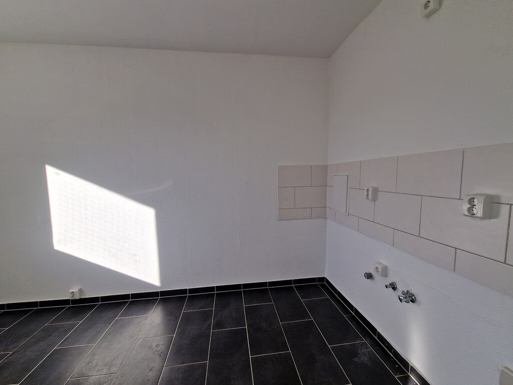 - Anthrazite Boden- und weiße Wandfliesen in der Küche