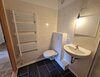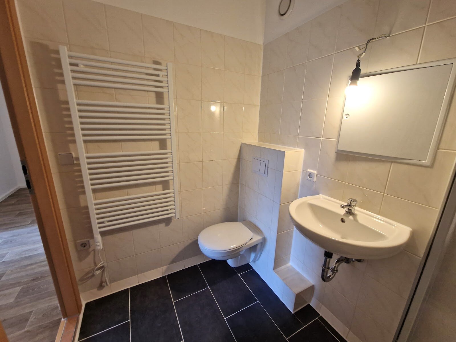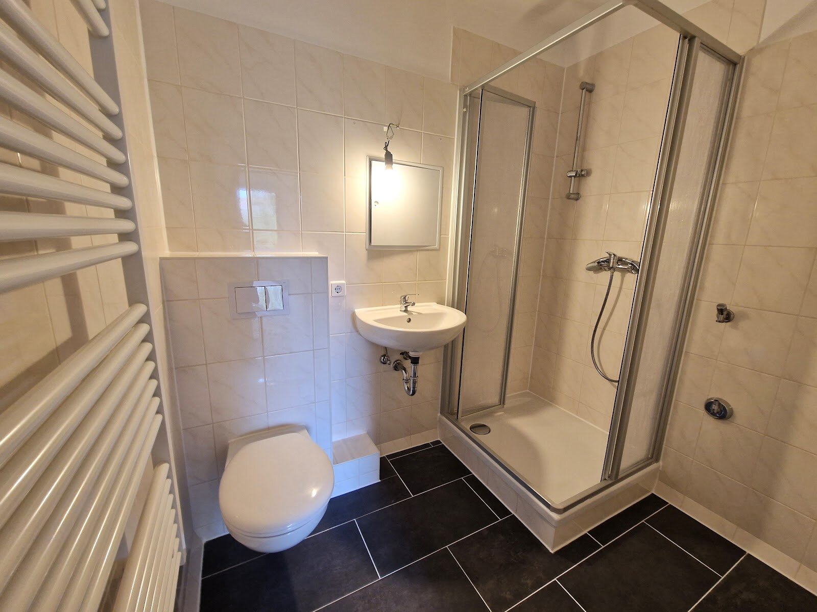 - Badezimmer mit Dusche, Waschmaschinenanschluss und Handtuchheizkörper
