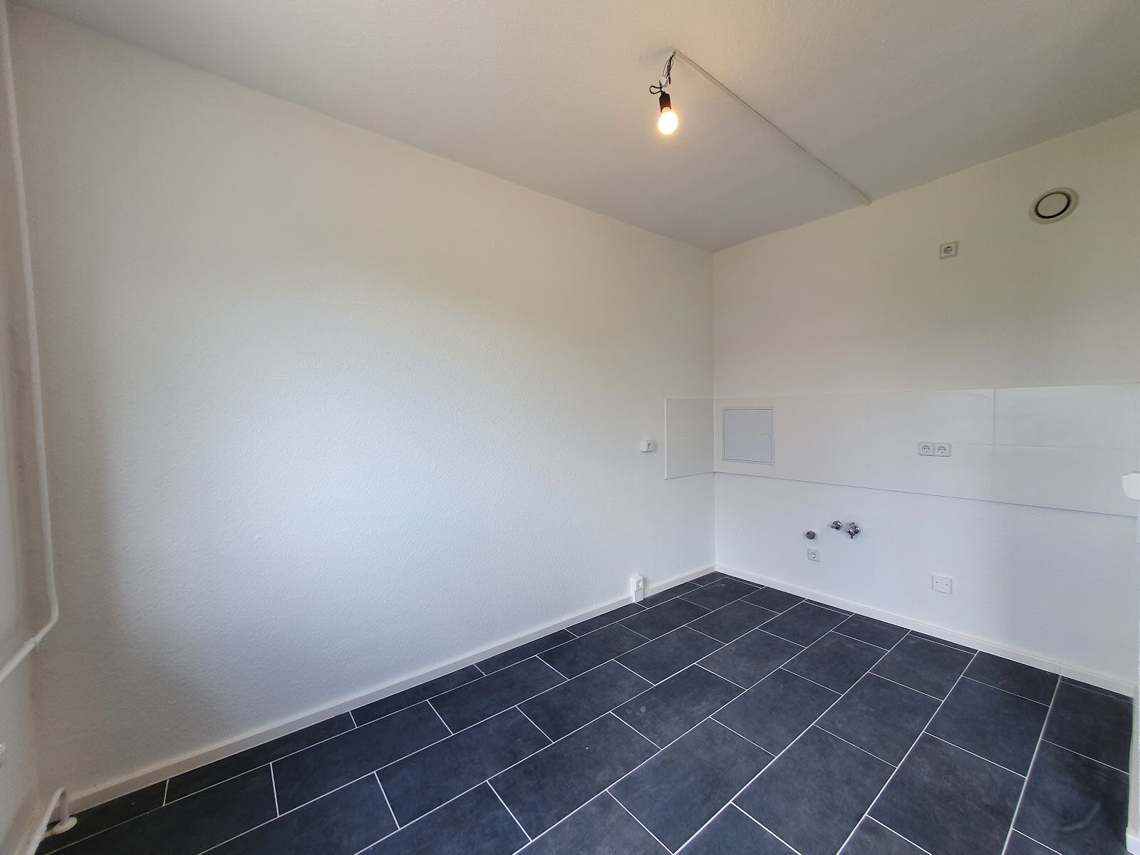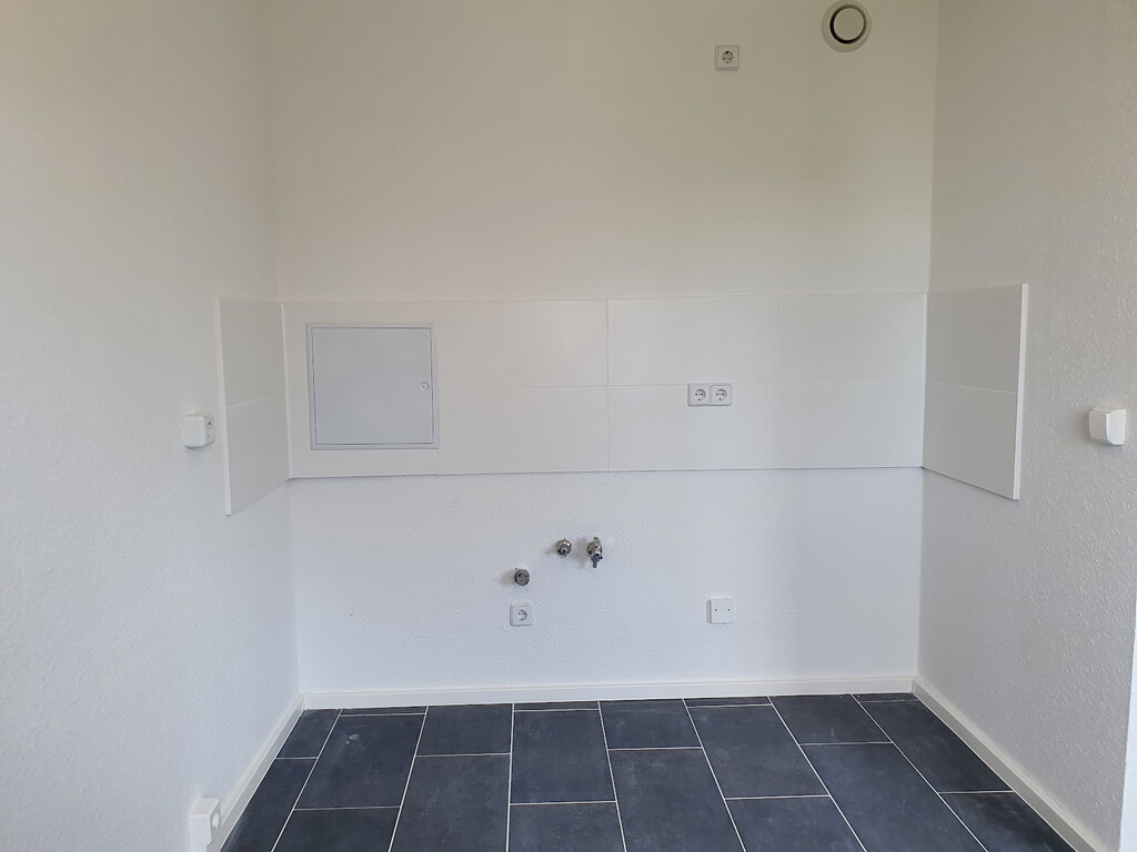 - Wohnbereich mit PVC-Boden und Raufasertapete – schlicht, pflegeleicht, bereit für Ihre Einrichtungsideen