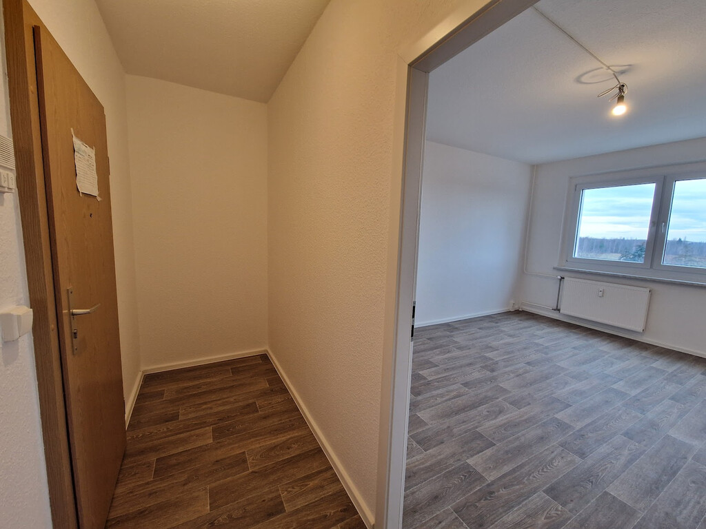 - Wohnbereich mit PVC-Boden und Raufasertapete – schlicht, pflegeleicht, bereit für Ihre Einrichtungsideen