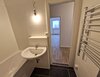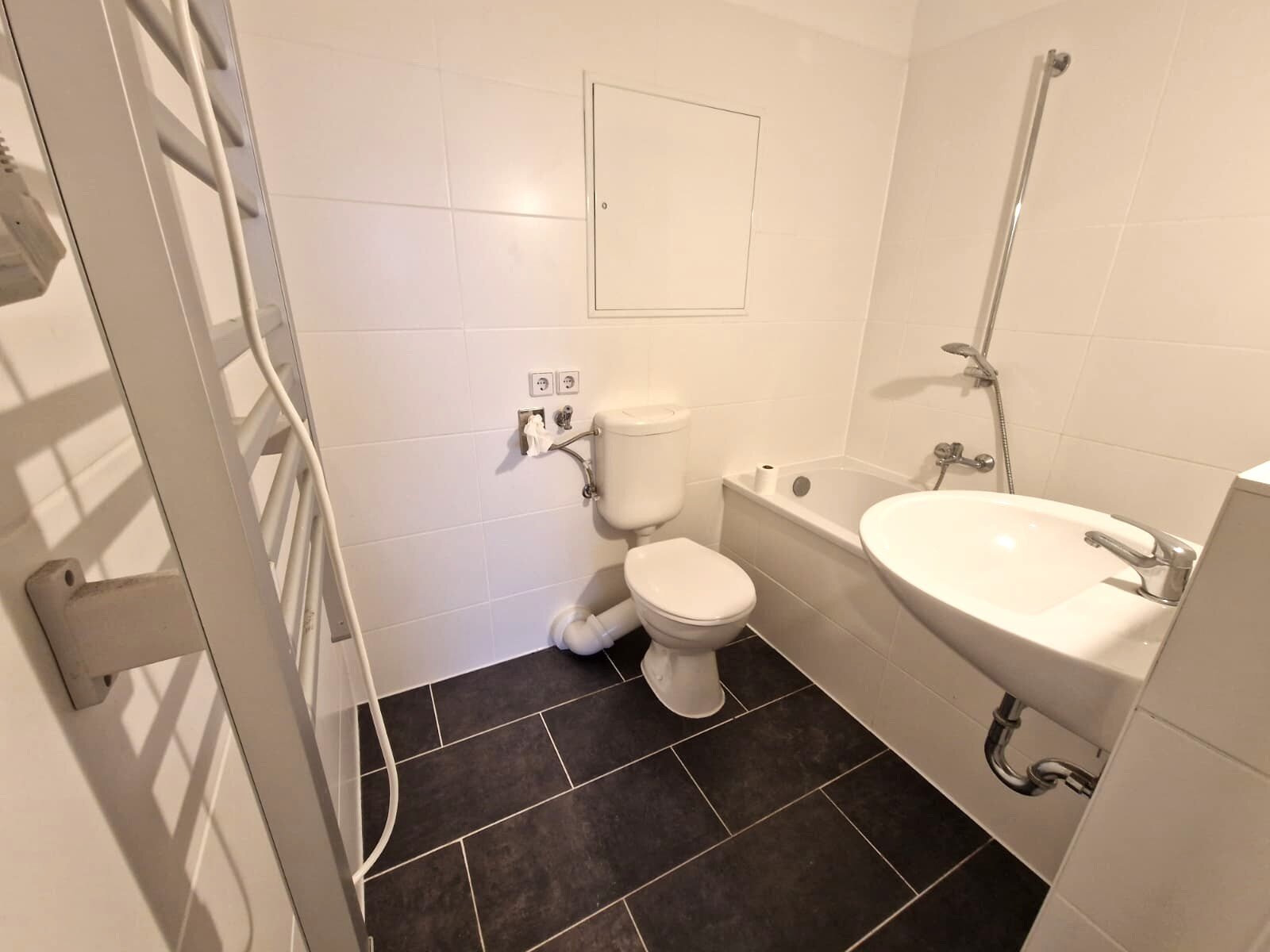 - Anthrazite Boden- und weiße Wandfliesen im Bad