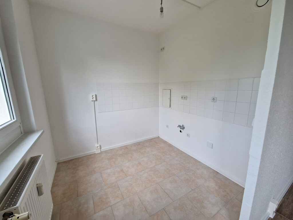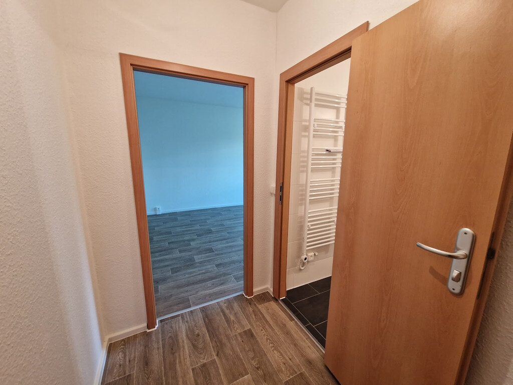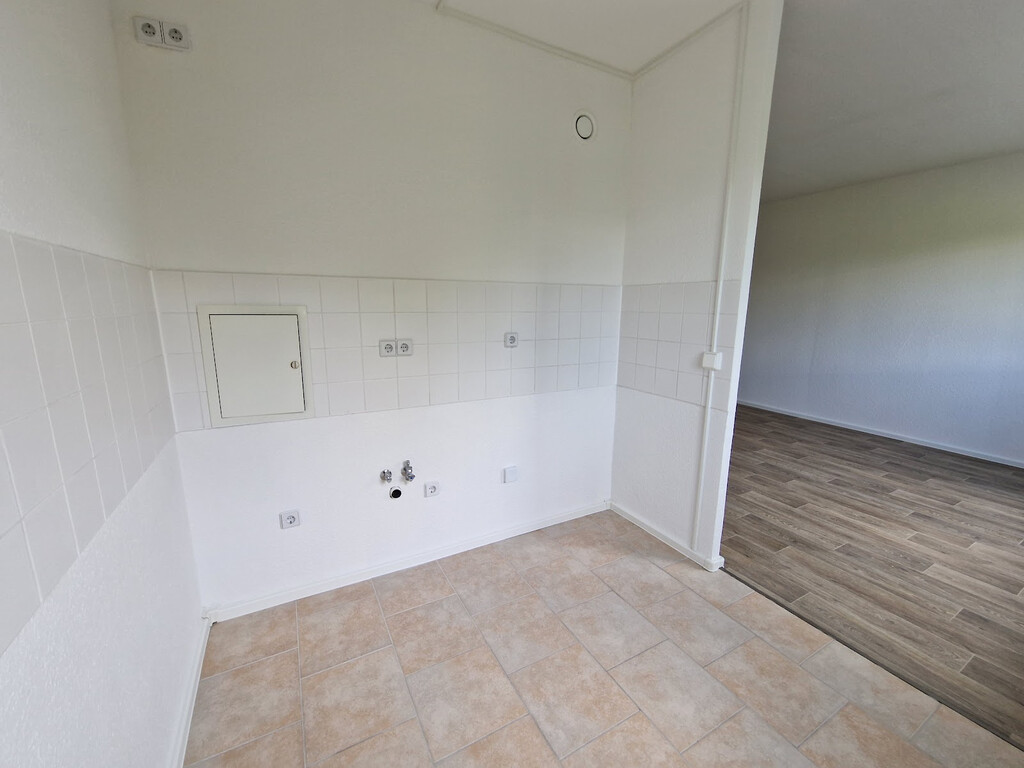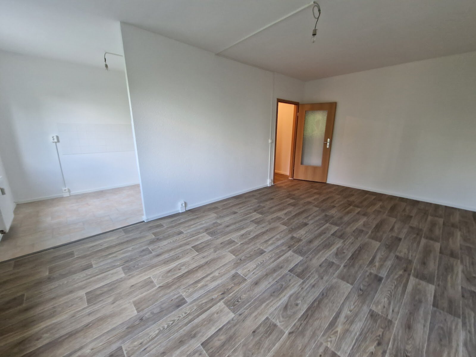 - Wohnbereich mit PVC-Boden und Raufasertapete – schlicht, pflegeleicht, bereit für Ihre Einrichtungsideen