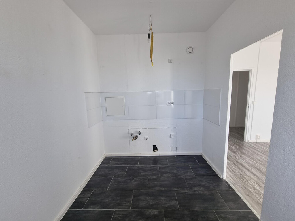 - Anthrazite Boden- und weiße Wandfliesen in der Küche